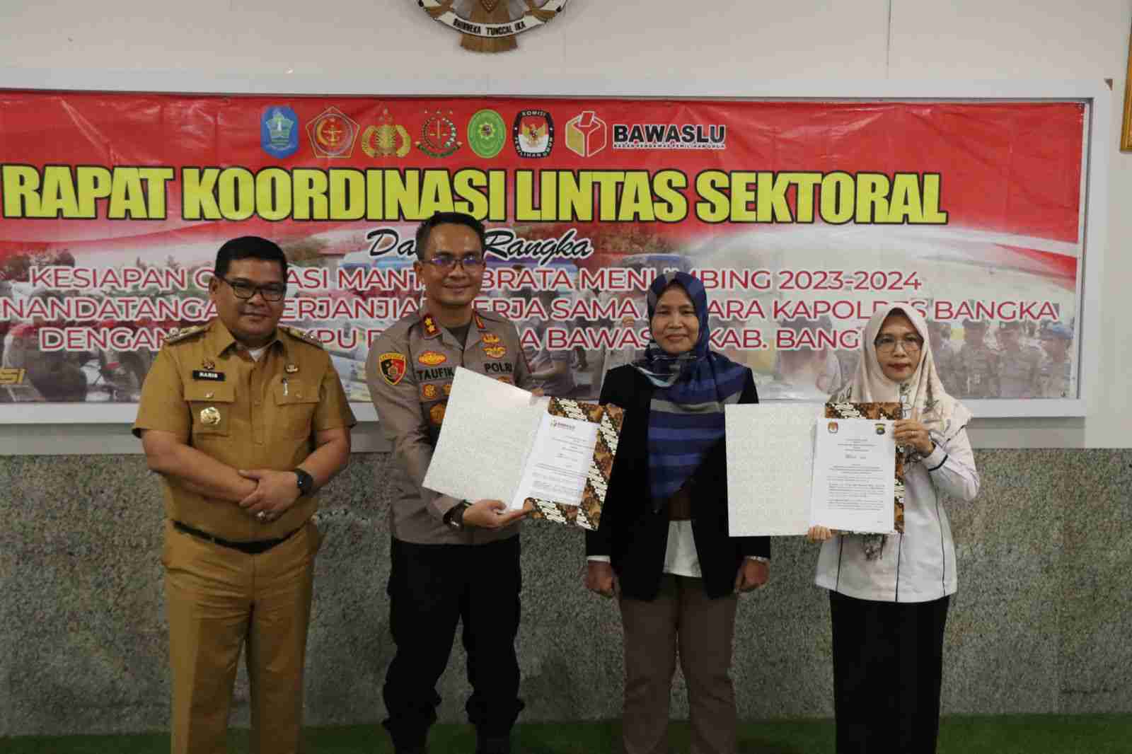 SUNGAILIAT – MB1 || Polres Bangka dan Pemerintah Kabupaten Bangka telah menandatangani MoU dalam persiapan Pemilu yang akan dilaksanakan di Kabupaten Bangka serta pelaksanaan Rakor Lintas Sektoral.bertempat di Aula Tribrata Polres Bangka.Senin (9/10/2023).