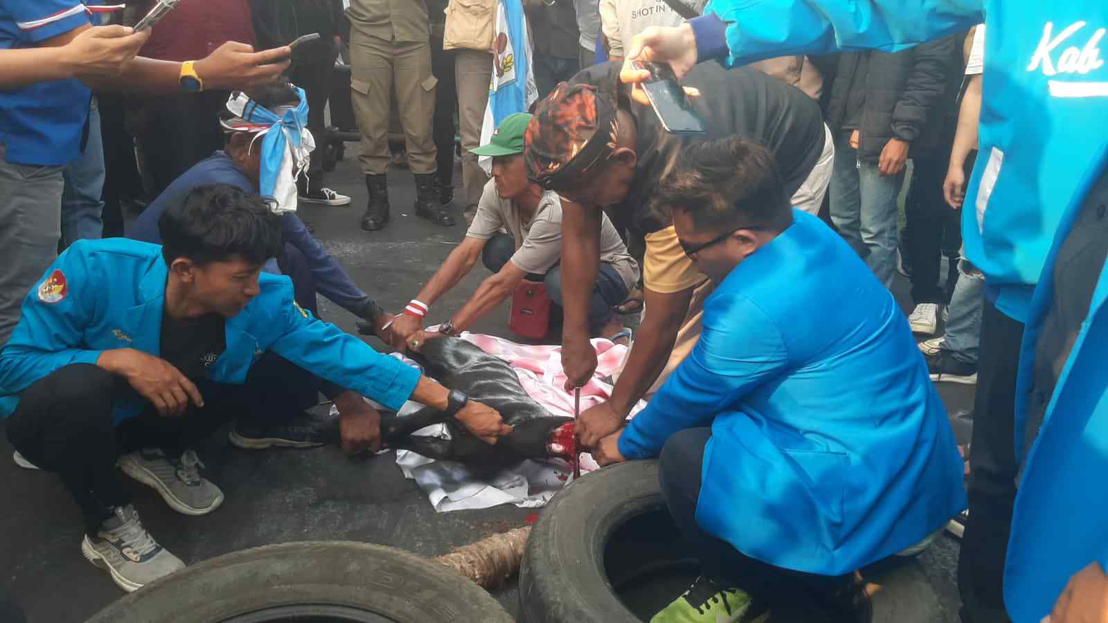 BOGOR – MB1 || Ratusan pengurus DPD (Dewan Pengurus Daerah) KNPI (Komite Nasional Pemuda Indonesia) dan seluruh OKP (Organiasi Kepemudaan) Se Kabupaten Bogor Provinsi Jawa Barat menggelar orasi penutup dengan memotong leher Bupati Iwan Setiawan, yang dicontohkan kepada seekor kambing, di depan Gedung Kantor Bupati, Jalan Tegar Beriman, Senin sore (09/10/2023).