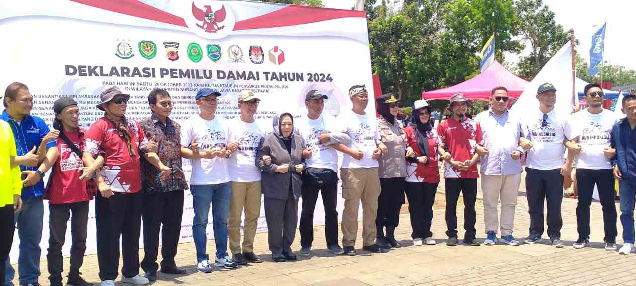 KABUPATEN SUBANG – JABAR – MB1 || Rangkaian kegiatan Penyelenggaraan Deklarasi Damai Pemilu 2024 yang diselenggarakan Ikatan Wartawan Online Indonesia ( IWO-I) DPD Kab Subang sukses digelar, Sebanyak 18 Pengurus Partai Politik ( Parpol) sebagai peserta pemilu menandatangani Deklarasi Damai Pemilu 2024 yang disaksikan Ketua KPU dan Bawaslu Kabupaten Subang beserta seluruh jajaran komisionernya, Bupati Subang diwakili Sekda, Ketua DPRD, Kajari diwakili Kasi Intel, Kapolres diwakili Kapolsek Kota, perwakilan dari Danlanud Suryadharma, Kasubag Kemendag, dan sejumlah tokoh masyarakat di antaranya tokoh nasional asal Kab Subang Jawa Barat Hj, Edeh L Poeradiredja , ketua MUI para kepala Dinas , Kepala Desa dan para camat serta dari unsur tokoh budaya, seni , ormas dan OKP, Sabtu ( 28/10/23) bertempat di lapangan Pelangi Subang