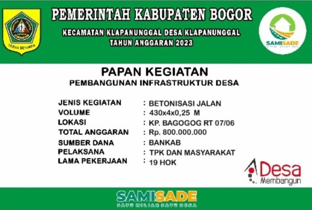 Seperti tampak di Papan Kegiatan Informasi pembangunan, diketahui jenis kegiatan betonisasi jalan dengan Volume 430 X 4 X 0,25 M. lokasi kampung Bagogok RT 07 RW. 04. Angaran, Rp. 800.000.000, Pelaksana TPK dan masyarakat atau swadaya, dengan lama pengerjaan 19 HOK.
