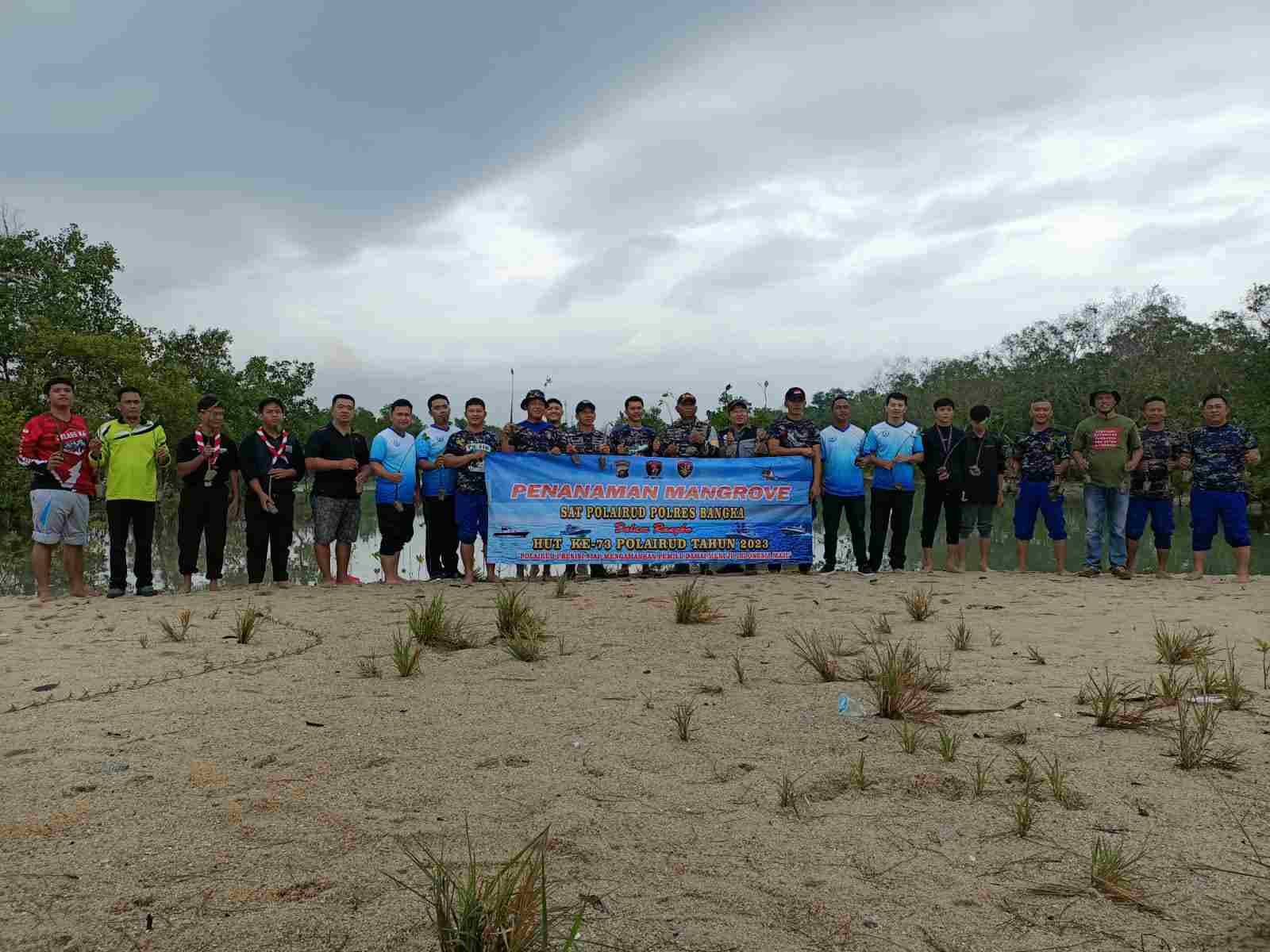 SUNGAILIAT – MB1 || Guna menjaga dan melestarikan lingkungan serta memberikan dampak positif bagi ekosistem wilayah pesisir. Satuan Polisi Air dan Udara (Polairud) Polres Bangka melakukan kegiatan Penanaman Mangrove dalam Rangka HUT – 73 POLAIRUD Tahun 2023. Sabtu (25/11/2023).