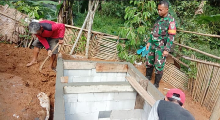 NANGGUNG-BOGOR-MB1 // Babinsa Desa Kalong Liud, Serda Supriyadi yang akrab di sapa (Edi) melaksanakan giat pemantauan pembangunan sanitasi dan pengadaan septic tank, yang berada di wilayah Desa Kalong Liud Kecamatan Nanggung Kabupaten Bogor, Pada, Senin, (11/12/2023).