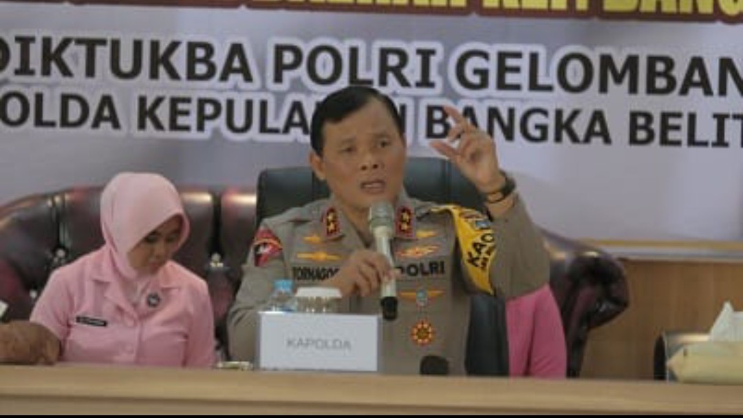 SUNGAILIAT – MB1 II Kapolda Kep. Babel Irjen Pol Dr. Tornagogo Sihombing, S.I.K., M.Si, CRGP,. Beserta Ketua Bhayangkari Daerah Kep. Babel, memberikan Pembekalan Kepada Siswa Diktukba Polri Gel...