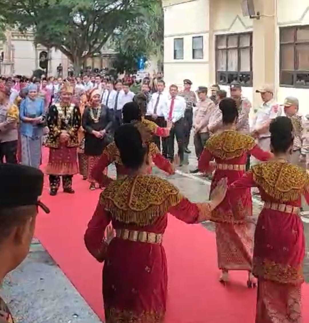 Kapolda Jambi Irjen Pol Rusdi Hartono usai mengikuti pengukuhan tokoh adat LAM Jambi kembali ke Mapolda Jambi dan di sambut dengan kompangan dan tari persembahan oleh Wakapolda Jambi dan PJU Polda Jambi dan Kapolres jajaran beserta personel.