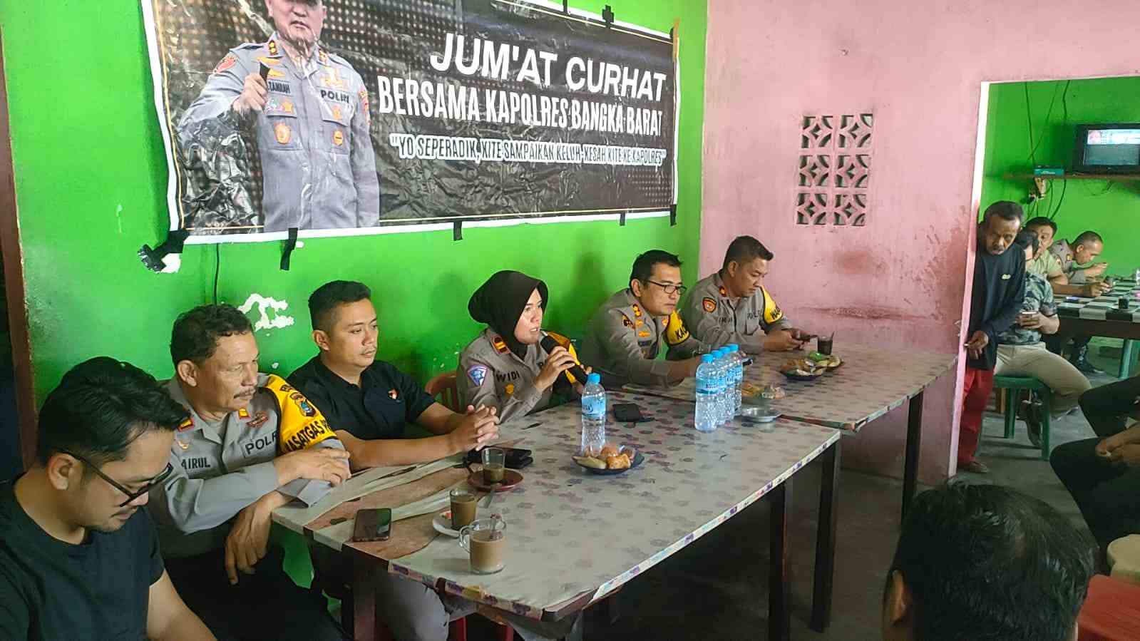 BANGKA BARAT – MB1 II Kapolres Bangka Barat AKBP Ade Zamrah SIK pimpin langsung program Jum’at curhat di Warkop surya bersama Masyarakat, guna mendengarkan, menyerap informasi sekaligus menerima masukan untuk peningkatan kinerja Polri, Jum’at (16/02/2024).