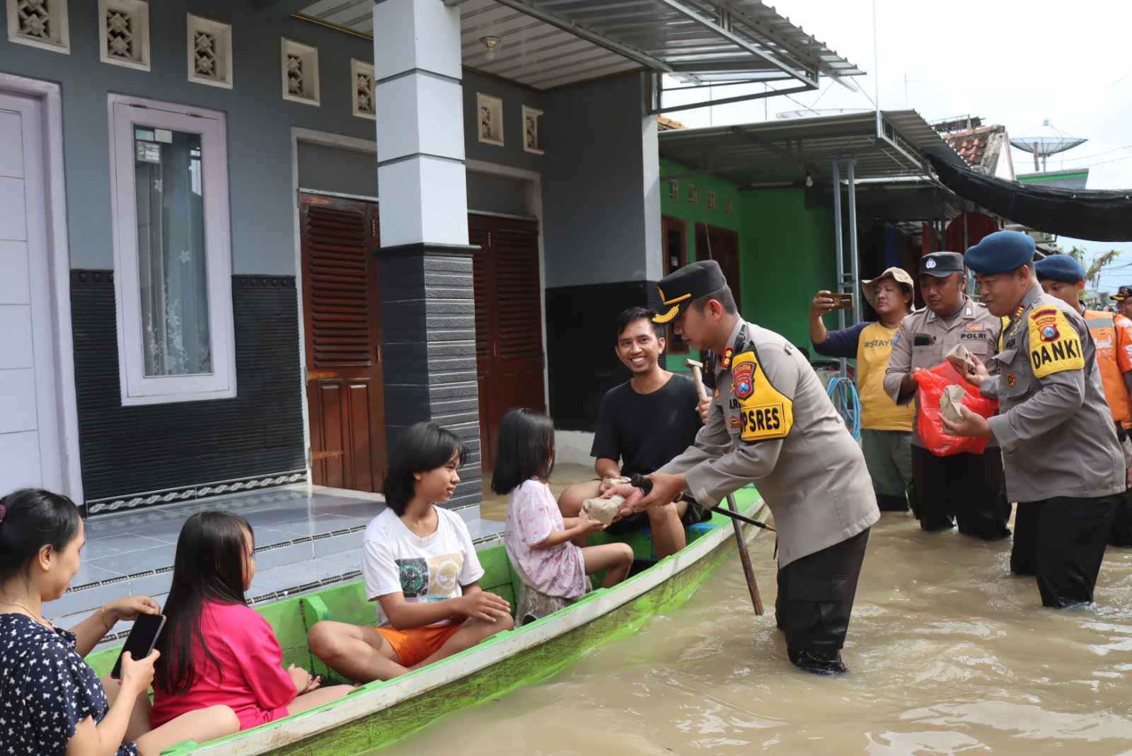 Sabar ya pak, bu semoga banjir cepat surut tetap waspada nggih ” ucap AKBP Mario sambil menyerahkan nasi bungkus kepada warga.