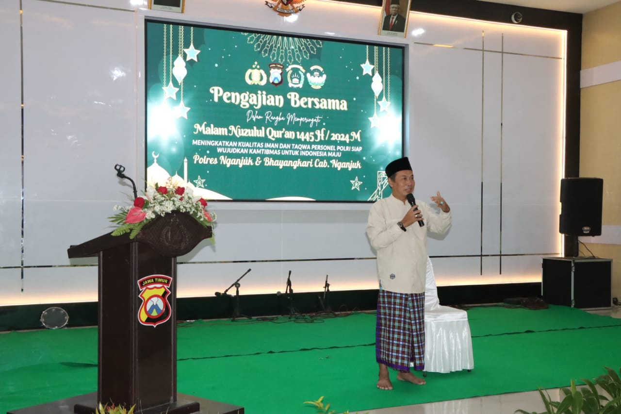 Acara digelar di aula Tantya sudhirajati polres nganjuk dengan tema meningkatkan kualitas iman dan Taqwa personel polri siap wujudkan kamtibmas untuk Indonesia maju menghadirkan Ulama kamtibmas kH. Mohammad yasir A. Pd. I.. Sebagai penceramah.