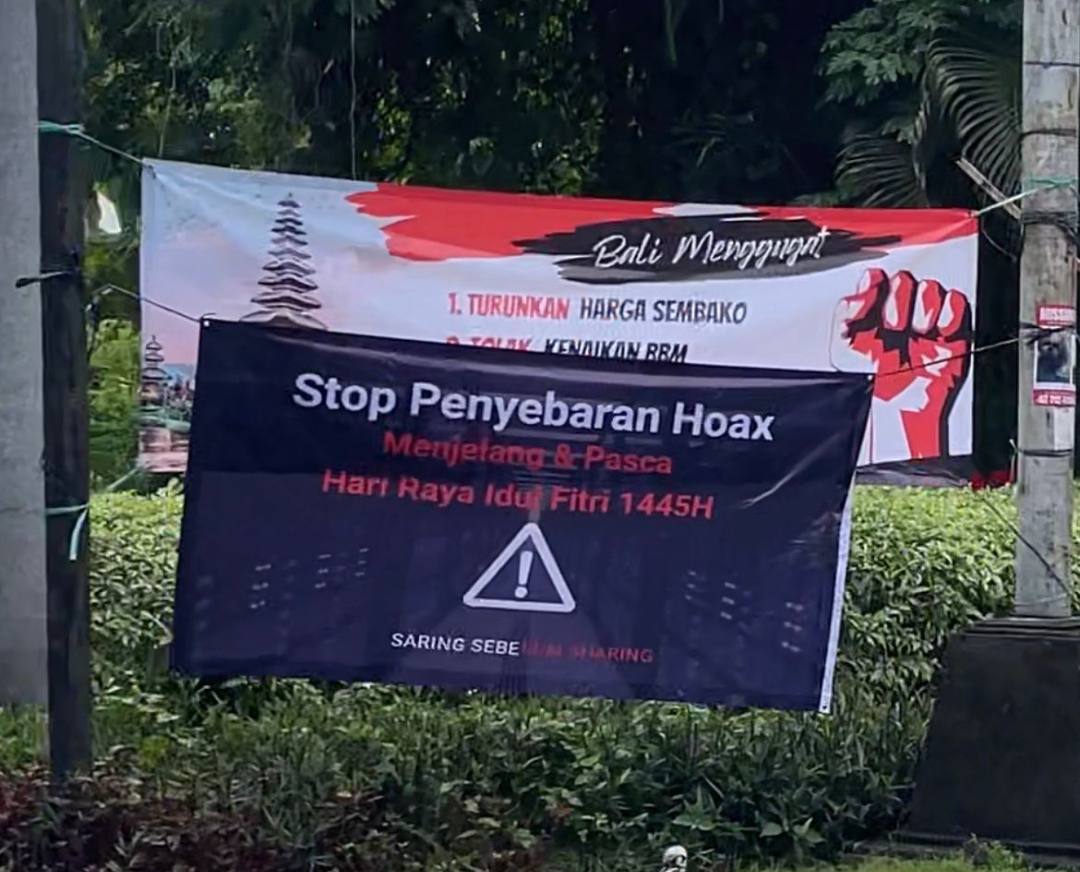 Spanduk liar tersebut diketahui terpasang di Lapangan Puputan Renon, Denpasar dengan nada “Stop Penyebaran Hoax, Menjelang Dan Pasca Hari Raya Idul Fitri 1445 H, Saring Sebelum Sharing”.