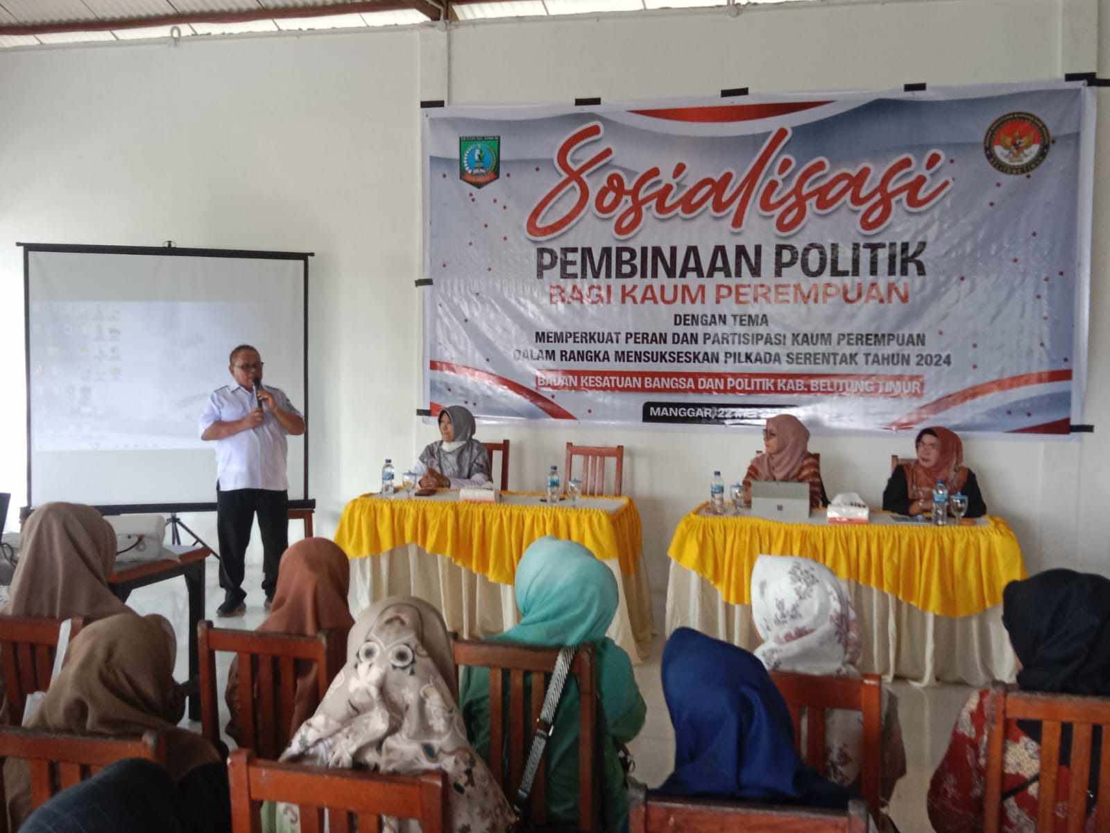 BELITUNG TIMUR, MB1 II Badan Kesatuan Bangsa dan Politik (Kesbangpol) Kabupaten Belitung Timur menggelar Sosialisasi Pendidikan Politik Bagi Perempuan. Sebanyak 60 ibu-ibu perwakilan dari 6 desa di Kecamatan Manggar hadir di Rumah Makan Dua Putri Pantai Serdang, Rabu (22/05/2024).