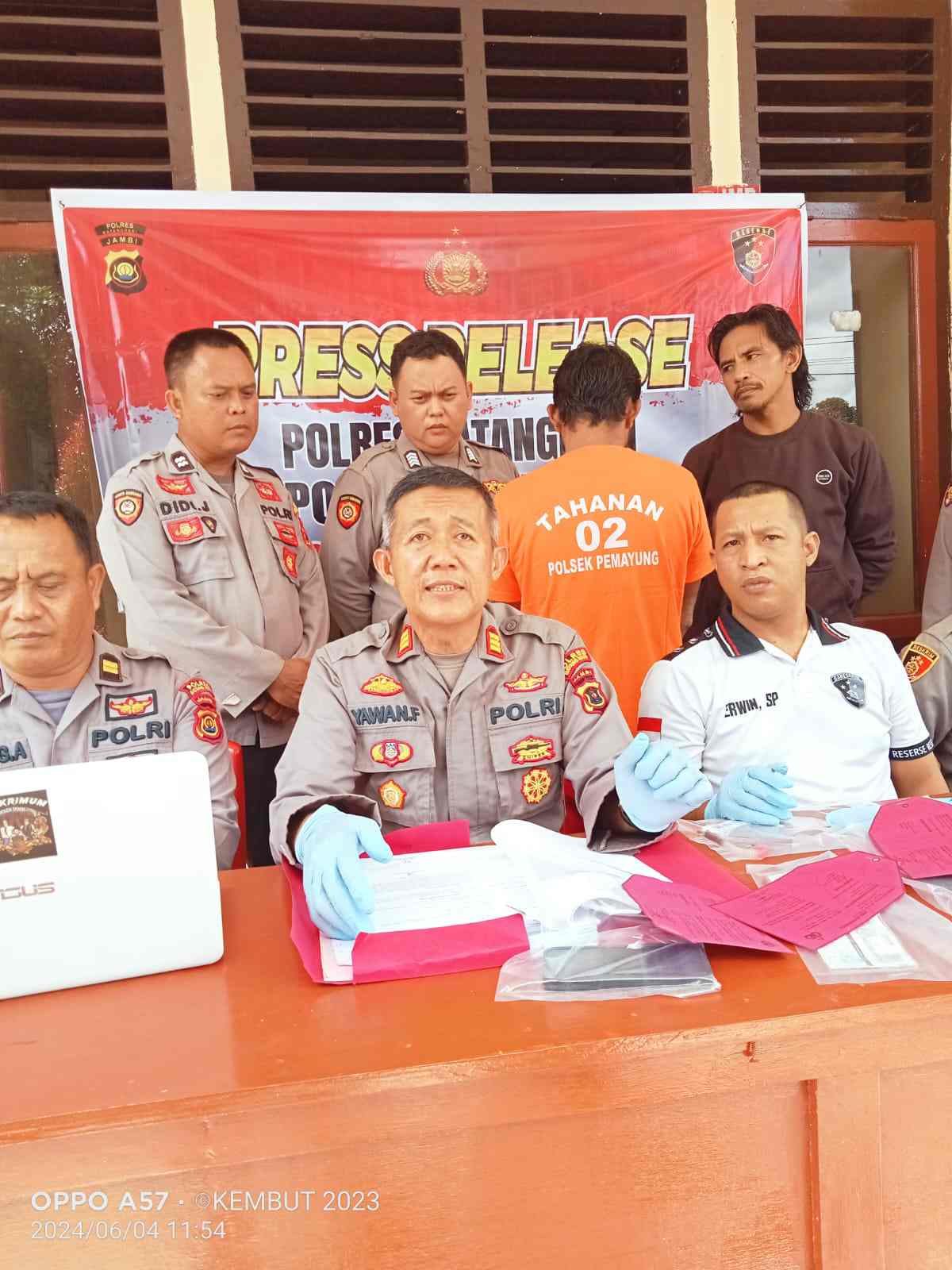 Dalam kesempatan tersebut Kapolsek Pemayung AKP Yawan Feriandy SE mengatakan, “Kronologi kejadiannya yaitu pada hari Kamis tanggal 30 Mei 2024 Sekira Pukul 12.00 Wib telah di amankan 1. ( Satu) Orang tersangka An.ABDUL HAMID Alias DUL Bin MUHIDIN di duga melakukan Tindak Pidana Pencurian dengan pemberatan.