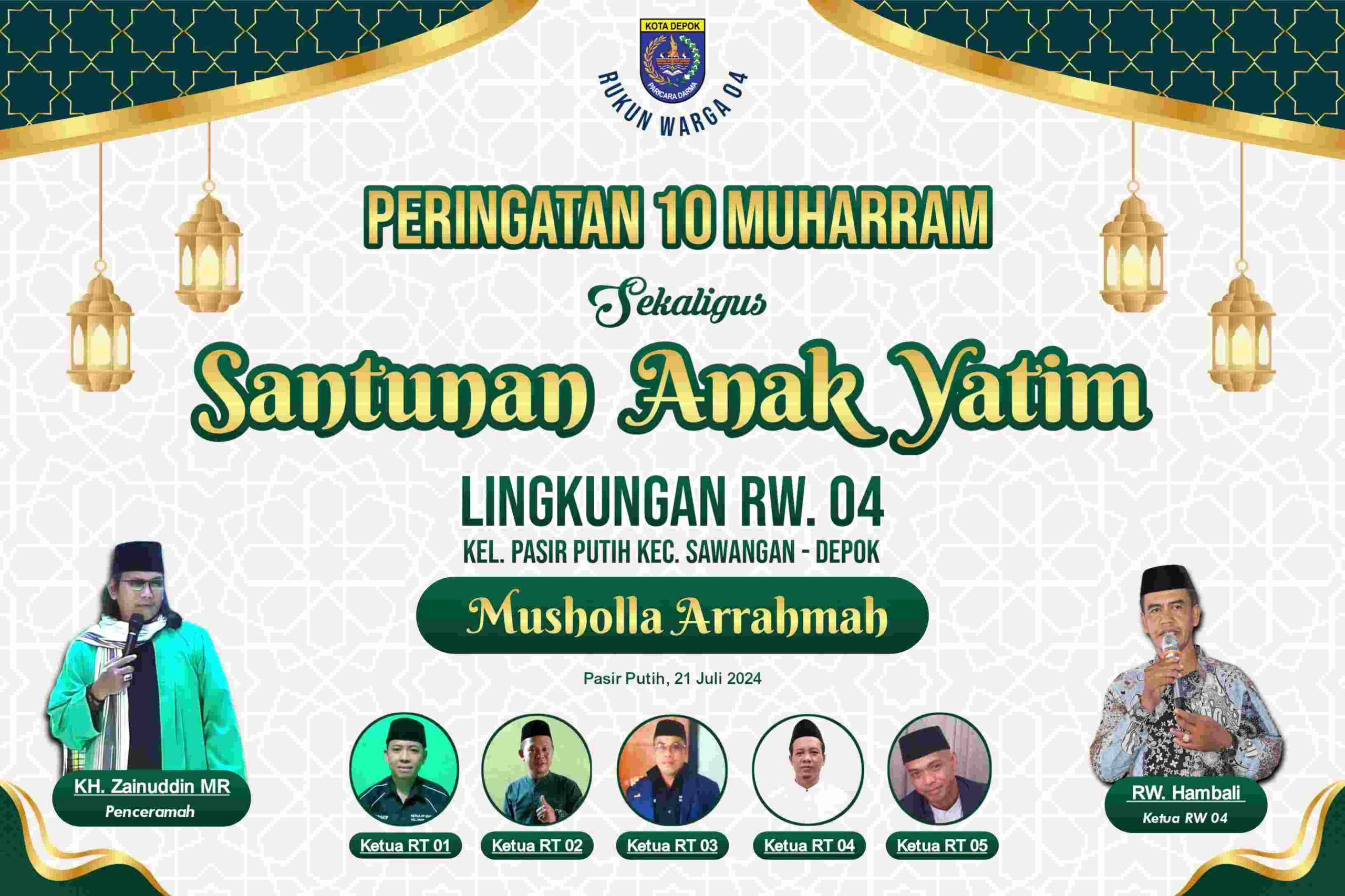 Adapun acara 1 Muharram 1446H tersebut diselenggarakan oleh panitia dengan mengadakan kegiatan kajian Islam oleh KH Zainuddin, MR serta melaksanakan santunan anak yatim di Musholah Ar Rahmah jalan nangka RT 004/04 Kelurahan Pasir Putih Kecamatan Sawangan Kota Depok pada hari ahad/minggu (21/7/2024).