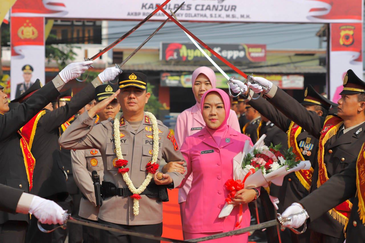 Acara diakhiri dengan Farewell Parade Pelepasan AKBP Aszhari Kurniawan dan Ny. Sri Aszhari ditandai dengan tradisi pedang pora dan berpamitan ke seluruh personel Polres Cianjur.