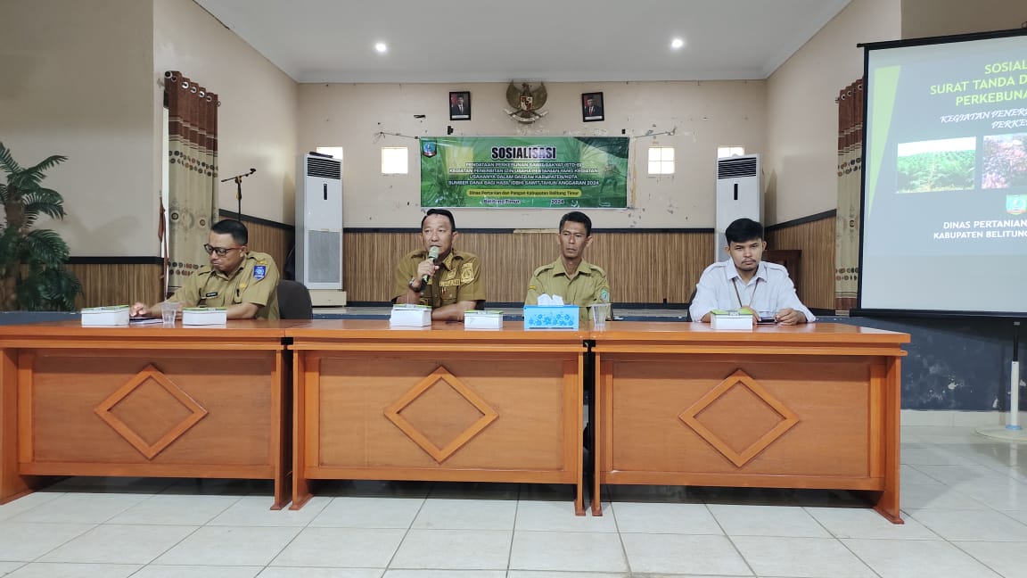BELITUNG TIMUR, MB1 II Dinas Pertanian dan Pangan Kabupaten Belitung Timur menggelar Sosialisasi Penerbitan Surat Tanda Daftar Budidaya (STDB) kepada 77 petani kelapa sawit di RSHBN, Kantor Bupati Beltim, Senin (05/08/2024).
