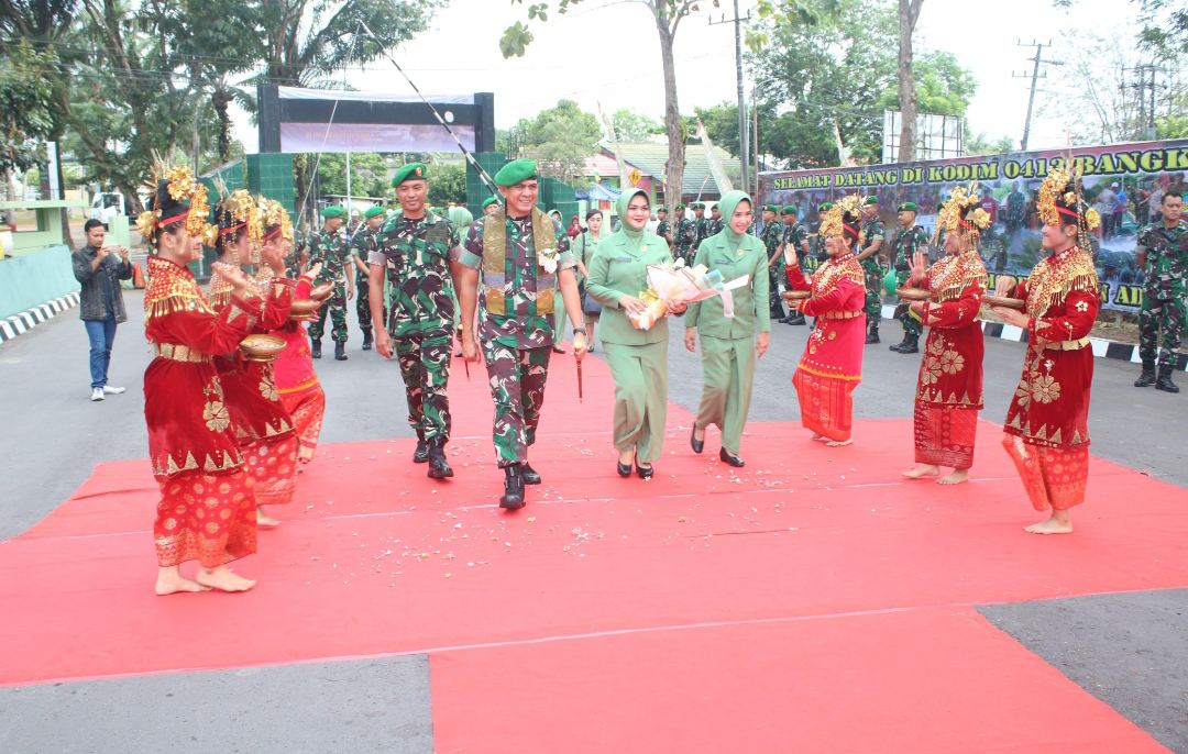 Usai menerima laporan Dandim 0413/Bangka, Komandan Korem 045/Gaya menerima pengalungan kain cual dan sajian tarian sekapur sirih dan hormat jajar oleh prajurit Kodim 0413/Bangka serta penyambutan dari Forkopimda Kota/ Kabupaten serta tokoh agama.