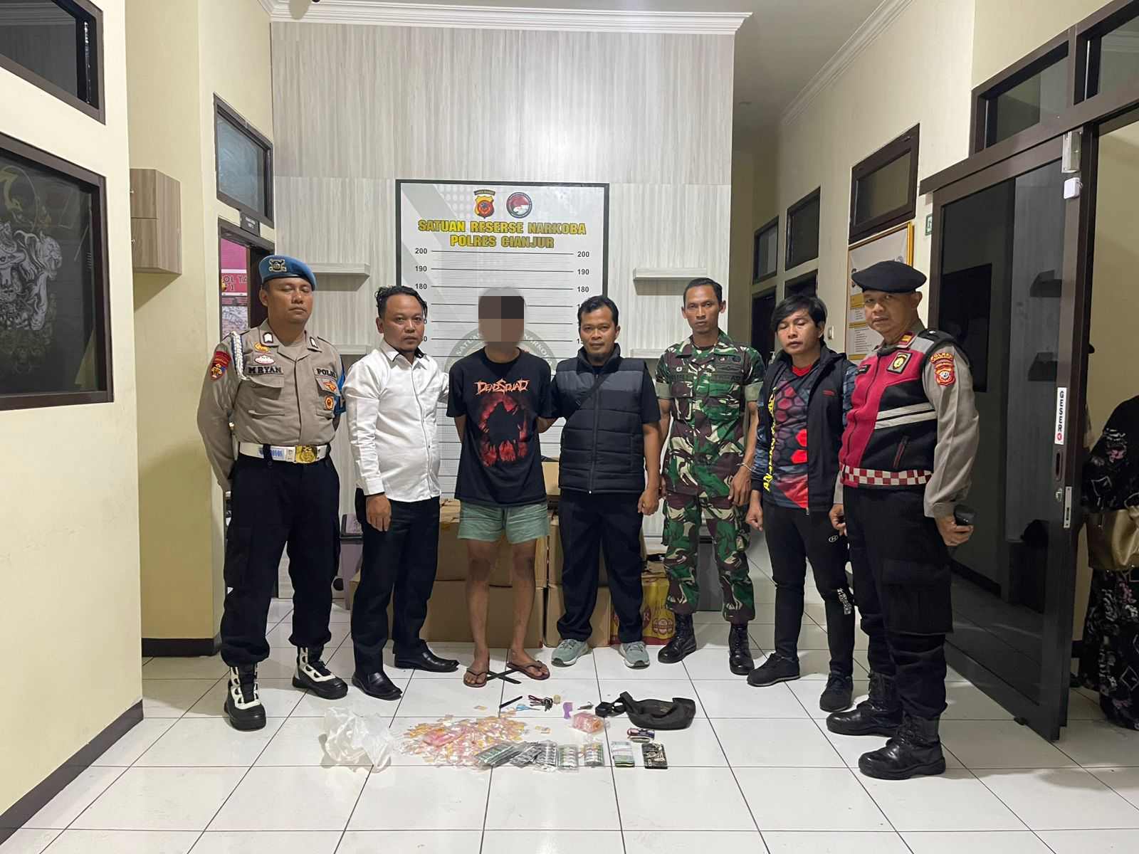 CIANJUR – JABAR, MB1 II Sinergitas TNI-Polri dalam rangka memberantas peredaran obat-obatan terlarang di Kabupaten Cianjur, Kodim 0608 Cianjur menangkap pelaku penjual obat-obatan terlarang beserta barang bukti untuk diserahkan ke Satresnarkoba Polres Cianjur, Selasa (01/10/2024).