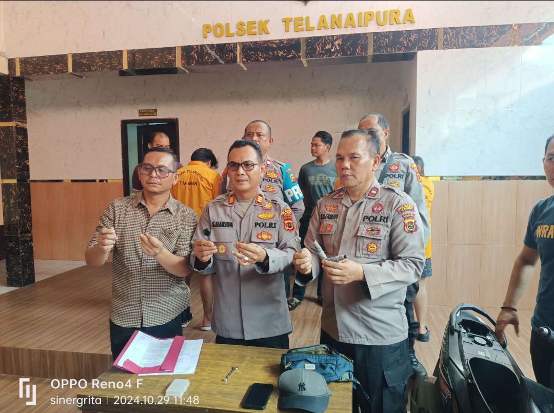 JAMBI, MB1 II Kapolsek Telanaipura AKP S Harefa SE MM didampingi Kanit Reskrim Iptu Junaidi SH MH memimpin langsung konferensi pers terkait keberhasilan pengungkapan kasus curanmor di Mapolsek Telanaipura (29/10).