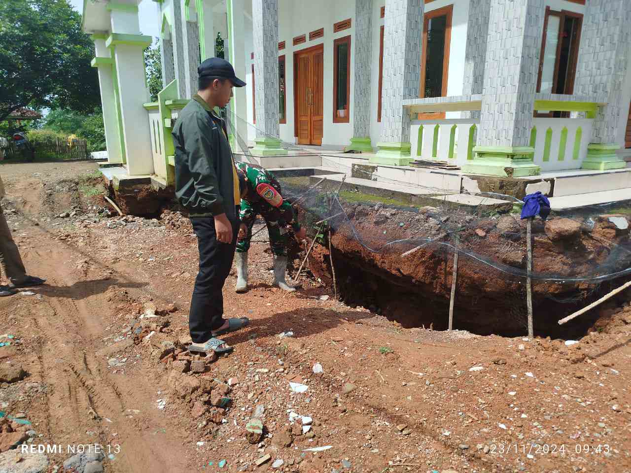 CIANJUR, MB1 II Polsek Takokak Polres Cianjur cek tempat kejadian perkara (TKP) kejadian bencana alam tanah bergerak di Kampung Cibuluh Desa Waringinsari Kecamatan Takokak Kabupaten Cianjur, Sabtu (23/11/2024).