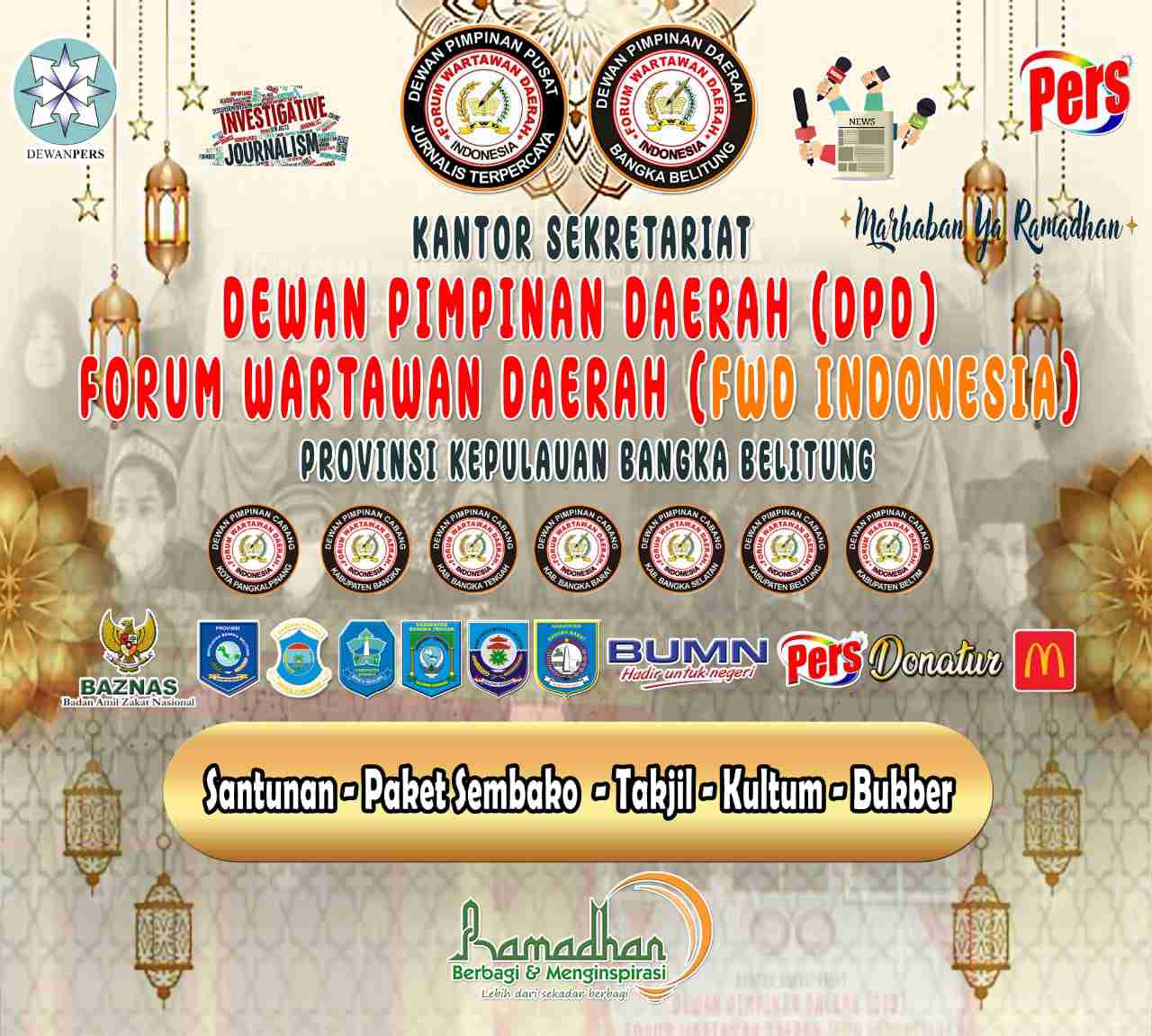 PANGKALPINANG, MB1 II Di penghujung bulan Suci Ramadhan DPD Forum Wartawan Daerah (FWD) Indonesia Provinsi Kepulauan Bangka Belitung Mengadakan Santunan anak Yatim-Piatu, Sembako,Takjil dan Bukber. Ke...