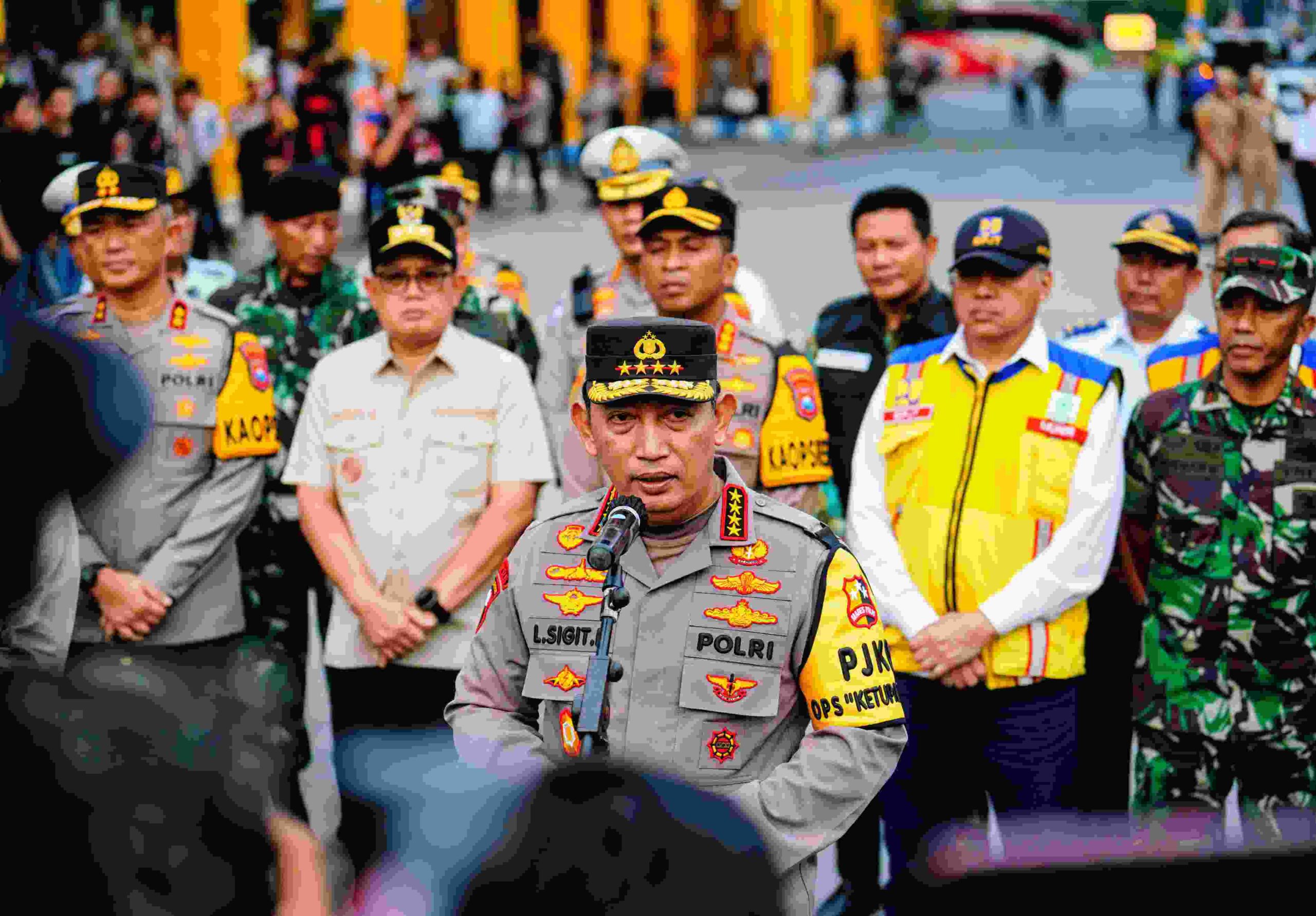 JAWA TIMUR, MB1 II Kapolri Jenderal Listyo Sigit Prabowo bersama Panglima TNI Jenderal Agus Subiyanto dan Menteri Perhubungan (Menhub) Budi Karya Sumadi melakukan pengecekan kesiapan arus mudik Lebara...