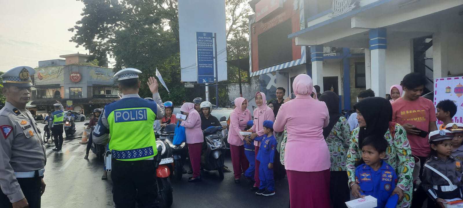BELITUNG, MB1 II Puluhan polisi cilik (pocil) murid TK Bhayangkari 04 Belitung membagi-bagikan takjil kepada pengendara yang melintas, Senin (25/03/2024) sore. Kegiatan membagi-bagikan takjil tersebut...