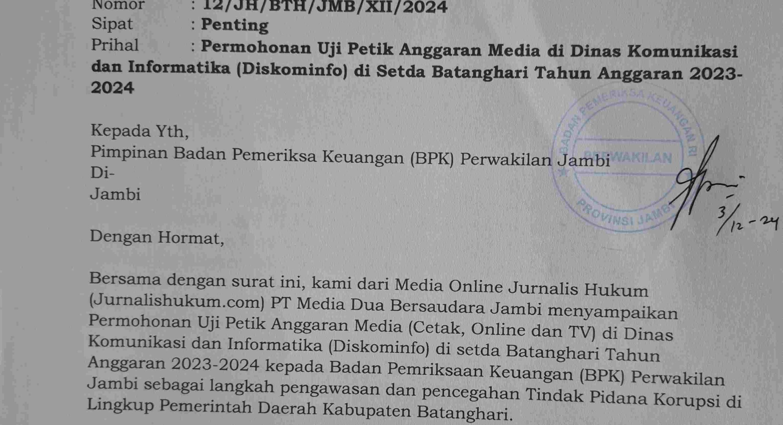 JAMBI, MB1 II Jurnalis Hukum (JH) atau di sebut Media Online Jurnalishukum.com kembali menyurati pimpinan Badan Pemeriksaan Keuangan (BPK) RI Perwakilan Jambi terkait dengan Permohonan Uji Petik perge...