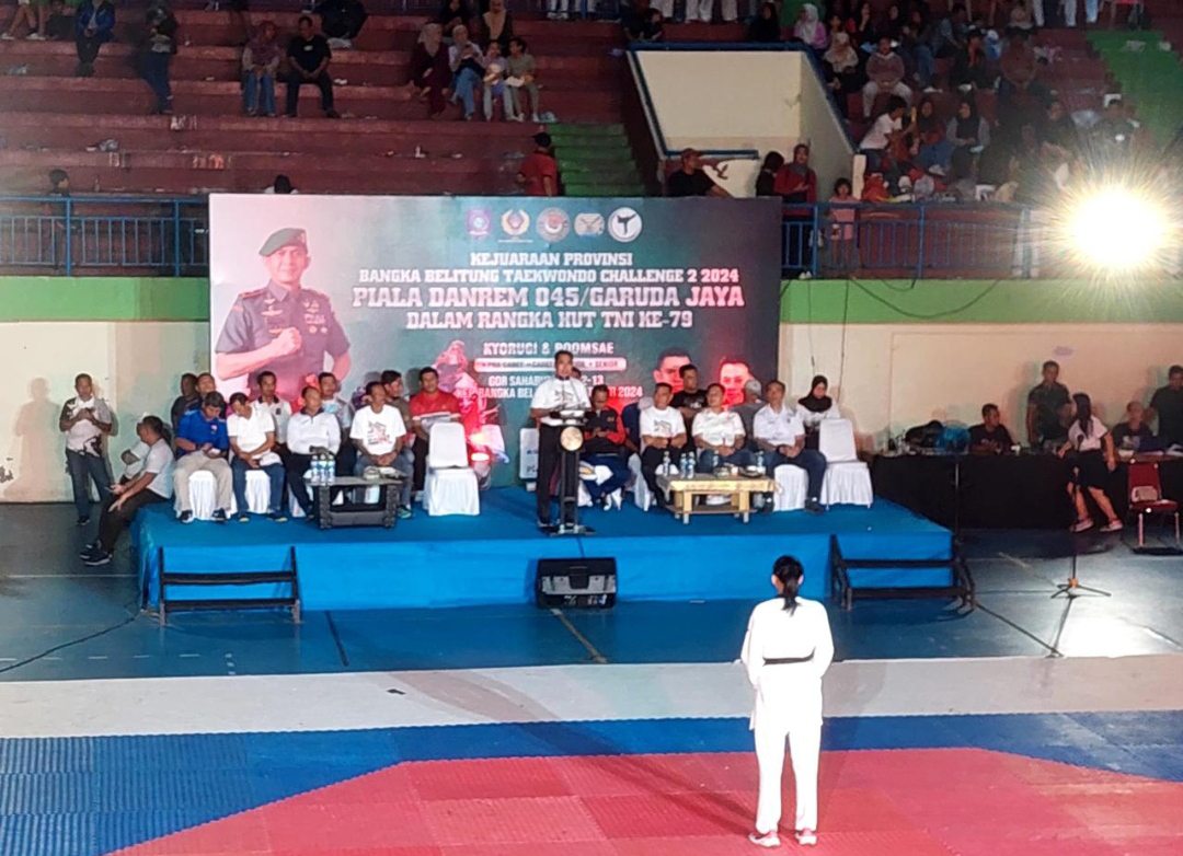 PANGKALPINANG, MB1 II Dalam rangka Hari Ulang Tahun TNI ke -79 , Korem 045/Gaya menggelar kejuaraan Taekwondo Piala Danrem Cup 2024 bertempat di Gor Sahabudin Pangkalpinang Prov. Kep Babel Sabtu (12/1...