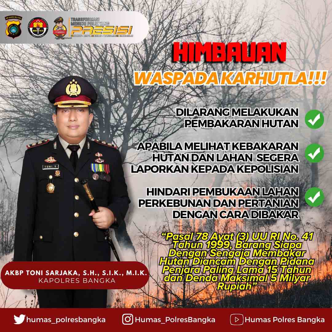 BANGKA, MB1 II Kapolres Bangka, AKBP Toni Sarjaka, menghimbau masyarakat untuk meningkatkan kewaspadaan terhadap kebakaran hutan dan lahan (Karhutla) yang berpotensi terjadi di wilayah Bangka. Himbaua...