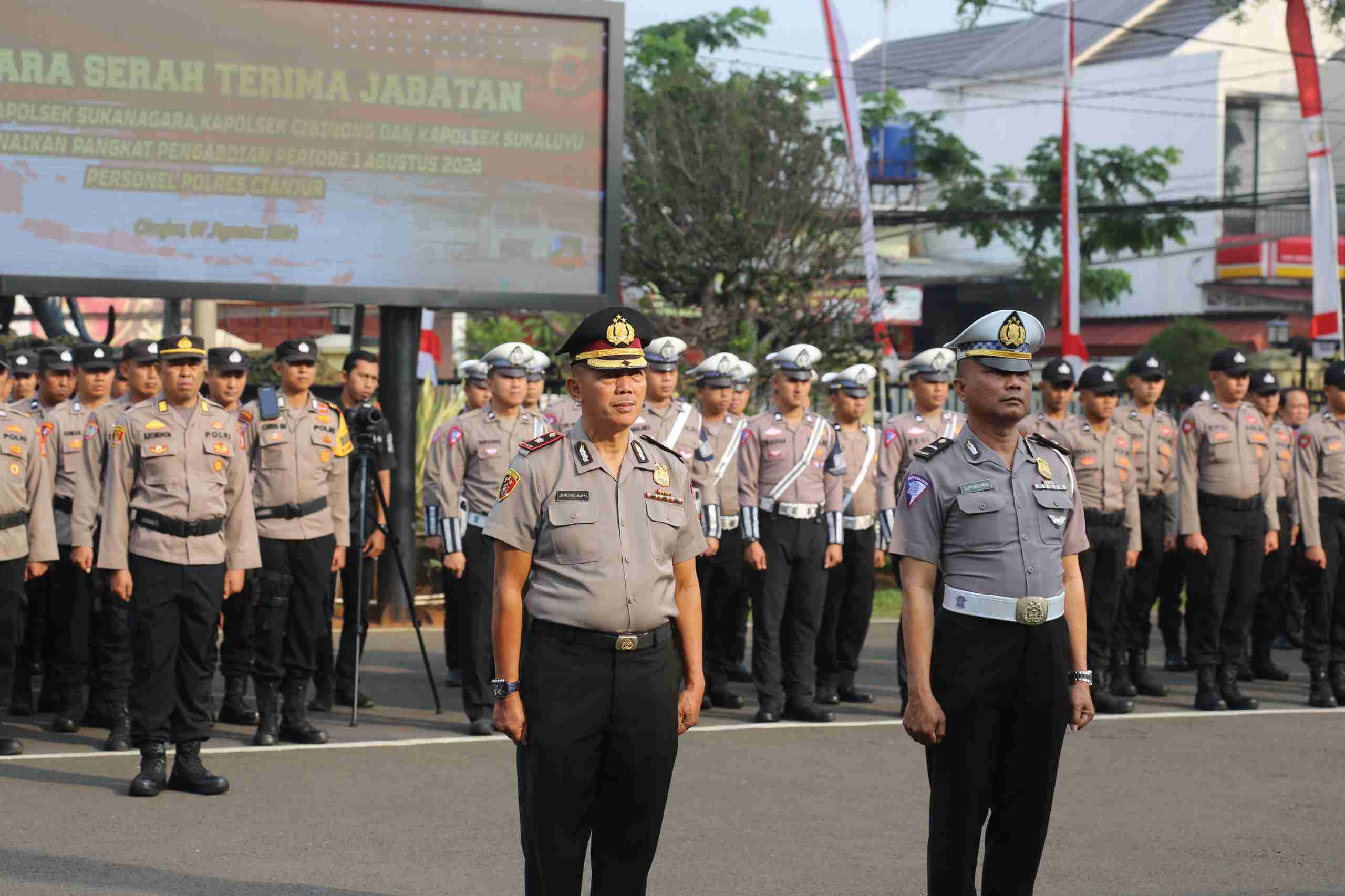 CIANJUR, MB1 II Kapolres Cianjur AKBP Rohman Yonky Dilatha, S.I.K., M.Si., M.H., memimpin kegiatan serah terima jabatan sejumlah Kapolsek Jajaran Polres Cianjur serta Korps Raport Kenaikan Pangkat Pen...