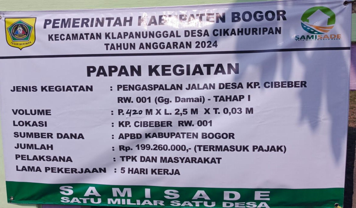 CIKAHURIPAN – KLAPANUNGGAL – BOGOR, MB1 II Pemerintahan Desa Cikahuripan Kecamatan Klapanunggal Nunggal Kabupaten Bogor mengalokasikan anggaran Satu Miliar Satu Desa (Samisade) bantuan dar...