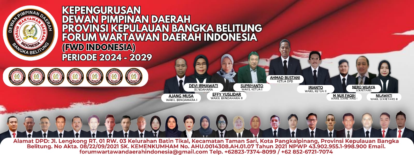 PANGKALPINANG, MB1 II Kepengurusan Forum Wartawan Daerah (FWD) Indonesia Provinsi Kepulauan Bangka Belitung Masa Bakti 2024-2029 Agustus dilantik dan dikukuhkan, Pelantikan akan dilaksanakan di salah ...
