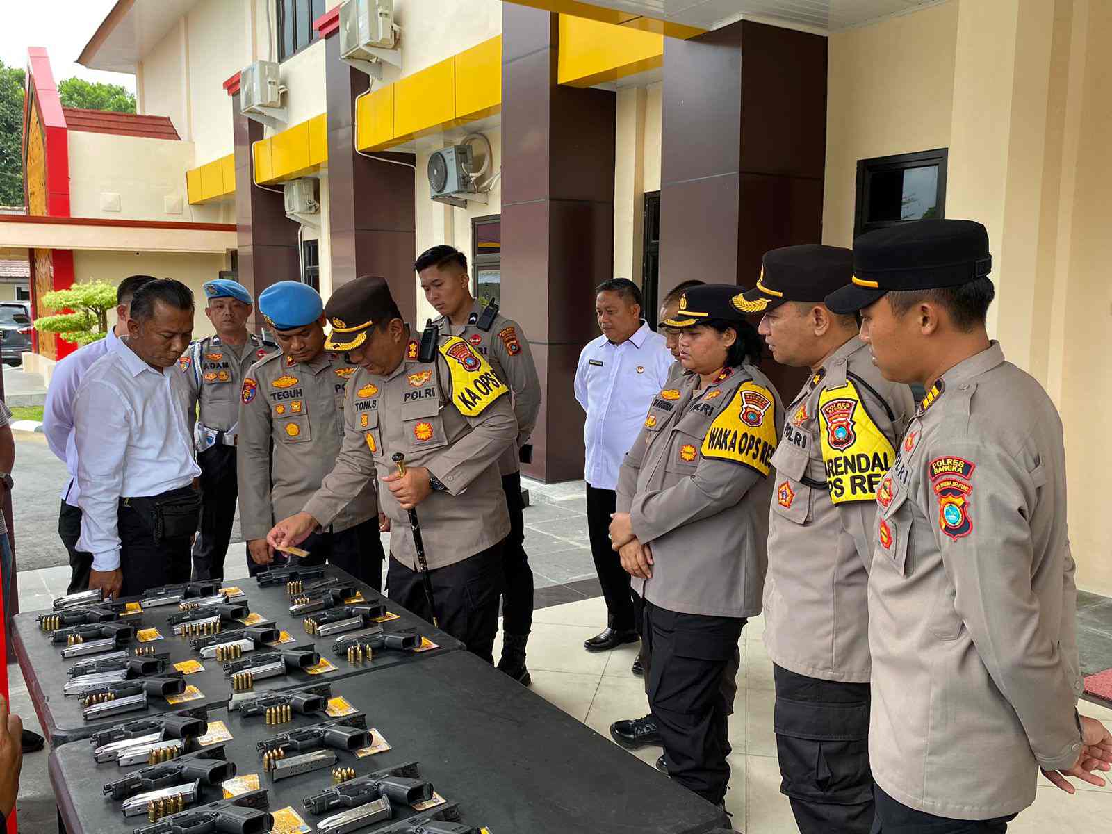 SUNGAILIAT, MB1 II Kepala Kepolisian Resor Bangka AKBP Toni Sarjaka, S.H.,S.I.K., M.I.K, melakukan pengecekan dan pemeriksaan secara langsung terhadap senjata api (senpi) dinas yang dipinjam pakaikan ...