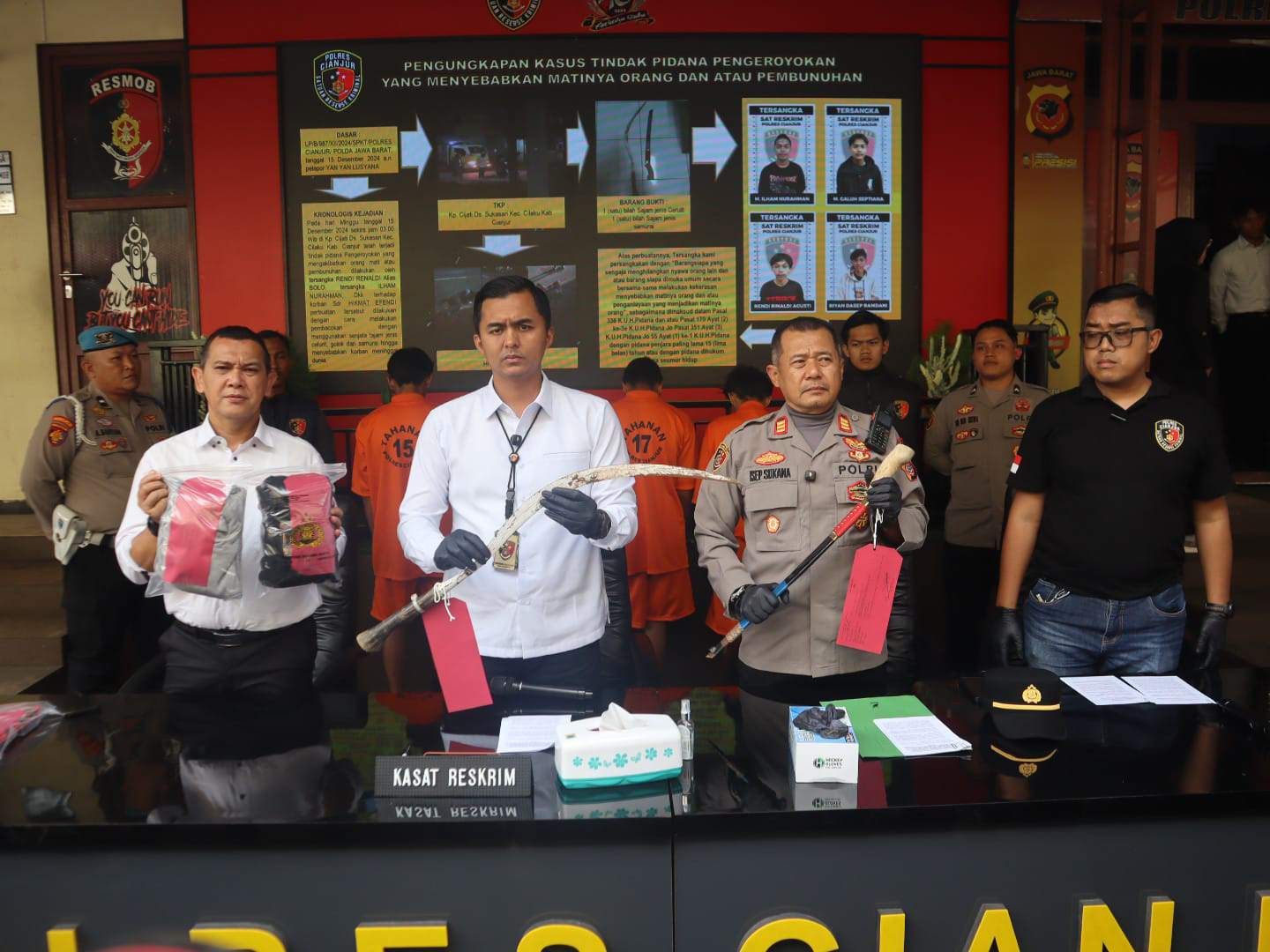 CIANJUR, MB1 II Sat reskrim Polres Cianjur melaksanakan konferensi pers pengungkapan kasus tindak pidana pengeroyokan yang mengakibatkan korban jiwa. Konferensi pers tersebut dipimpin oleh Kasatreskri...
