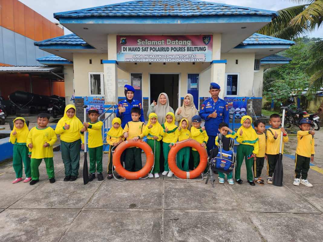 BELITUNG, MB1 II Polres Belitung dalam hal ini dilakukan Sat Polairud Polres Belitung Melaksanakan kegiatan Polisi Sahabat Anak (Polsanak) dengan kedatangan TK Ra Aisyiyah Bustanul Athfal X Desa juru ...