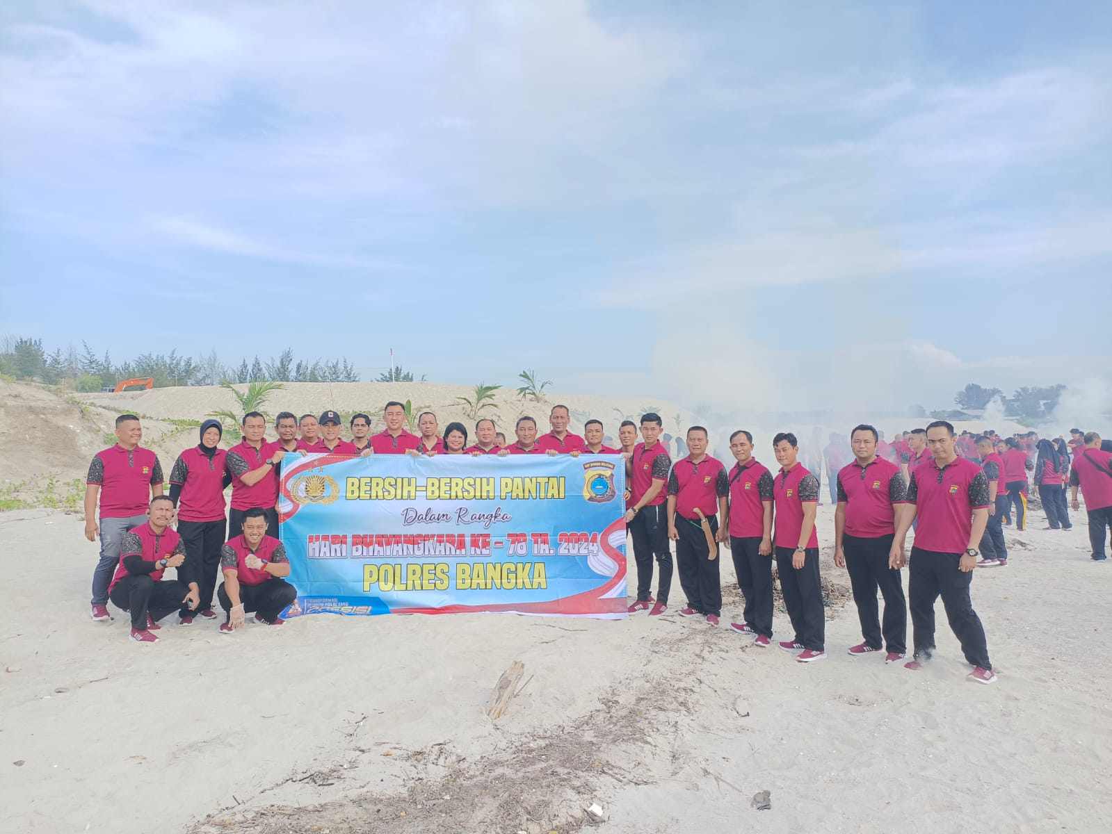 SUNGAILIAT, MB1 II Dalam memperingati Hari Ulang Tahun (HUT) Bhayangkara Ke 78, Kepolisian Resor Bangka melaksanakan kegiatan bersih-bersih pantai Jelitik Sungailiat Kabupaten Bangka, Jum’at (7/...
