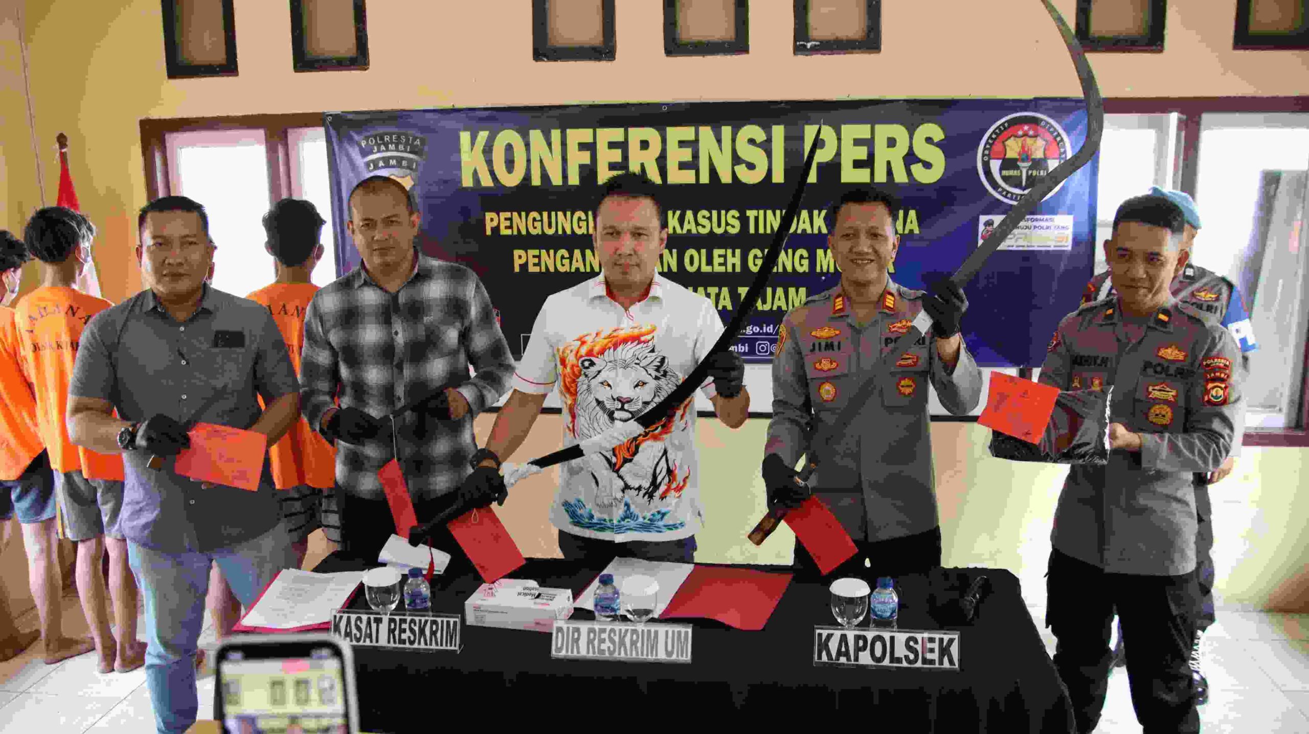 Press release dipimpin langsung oleh Direktur Reserse Kriminal Umum Polda Jambi Kombes Pol Dr. Manang Soebeti, S.I.K, M.Si didampingi Kasat Reskrim Polresta Jambi Kompol Marhara Tua Siregar, S.E, S.I.K, Kapolsek Kota Baru Akp Jimi Fernando, S.I.K bersama Panitopsnal 1 Unit Reskrim Polsek Kota Baru Iptu Swando Parlindungan dan Kasi Humas Polresta Jambi Ipda Deddy Haryadi.
