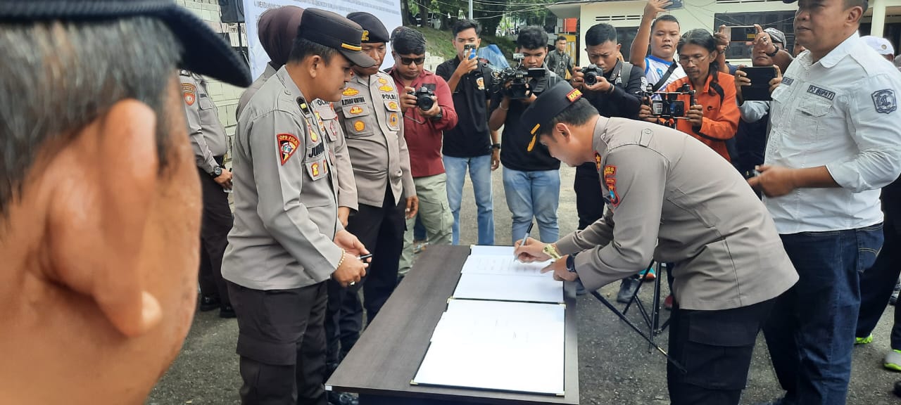 BELITUNG, MB1 II Polres Belitung, bersama Forkopimda Belitung, menggelar apel sekaligus penandatanganan deklarasi penolakan segala bentuk aktivitas geng motor yang dilaksanakan di halaman gedung nasional Kabupaten Belitung, kamis (23/01/2025).