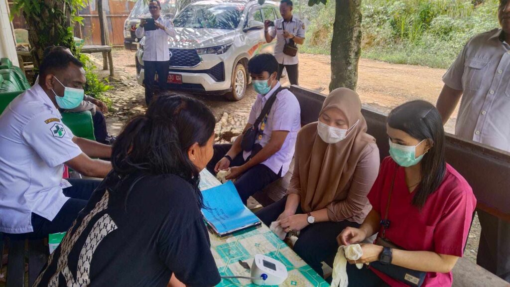 KOTAWARINGIN BARAT – KALTENG, MB1 II Sebagai upaya meningkatkan kesadaran masyarakat akan pentingnya kesehatan, tim Puskermas Karang Mulya dr Nova Wulandari, Palufi (dr umum) ,Kapolsek Pangkalan Banteng Iptu Agung Sugiarto SH, MH ,Kades Sungai Pakit, Kasun Amin Jaya ,dan petugas Puskesmas Karang Mulya melakukan kegiatan pendampingan pemeriksaan kesehatan secara door to door di wilayah Kecamatan Pangkalan Banteng Kabupaten Kotawaringin Barat, kegiatan ini bertujuan untuk mempermudah akses layanan kesehatan bagi warga yang sulit menjangkau fasilitas kesehatan.