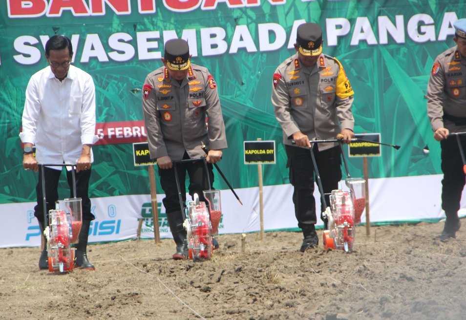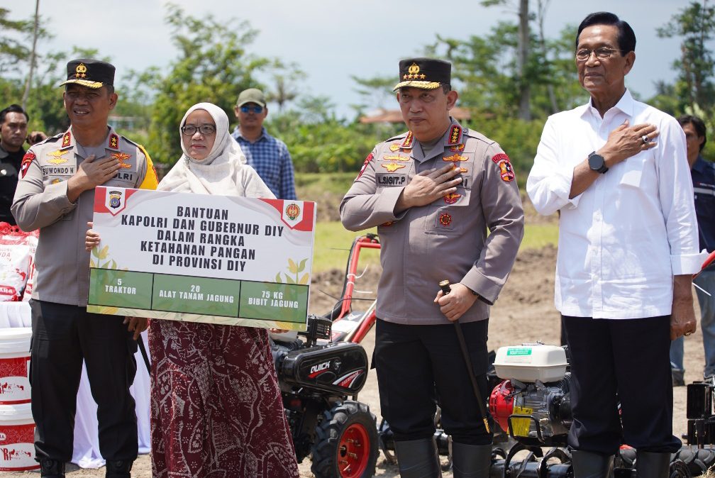 JAKARTA, MB1 II Kapolri Jenderal Pol Listyo Sigit Prabowo dan Gubernur DIY, Sri Sultan Hamengku Buwono X menanam jagung bersama di Dusun Klaras, Canden, Jetis, Bantul, Yogyakarta.