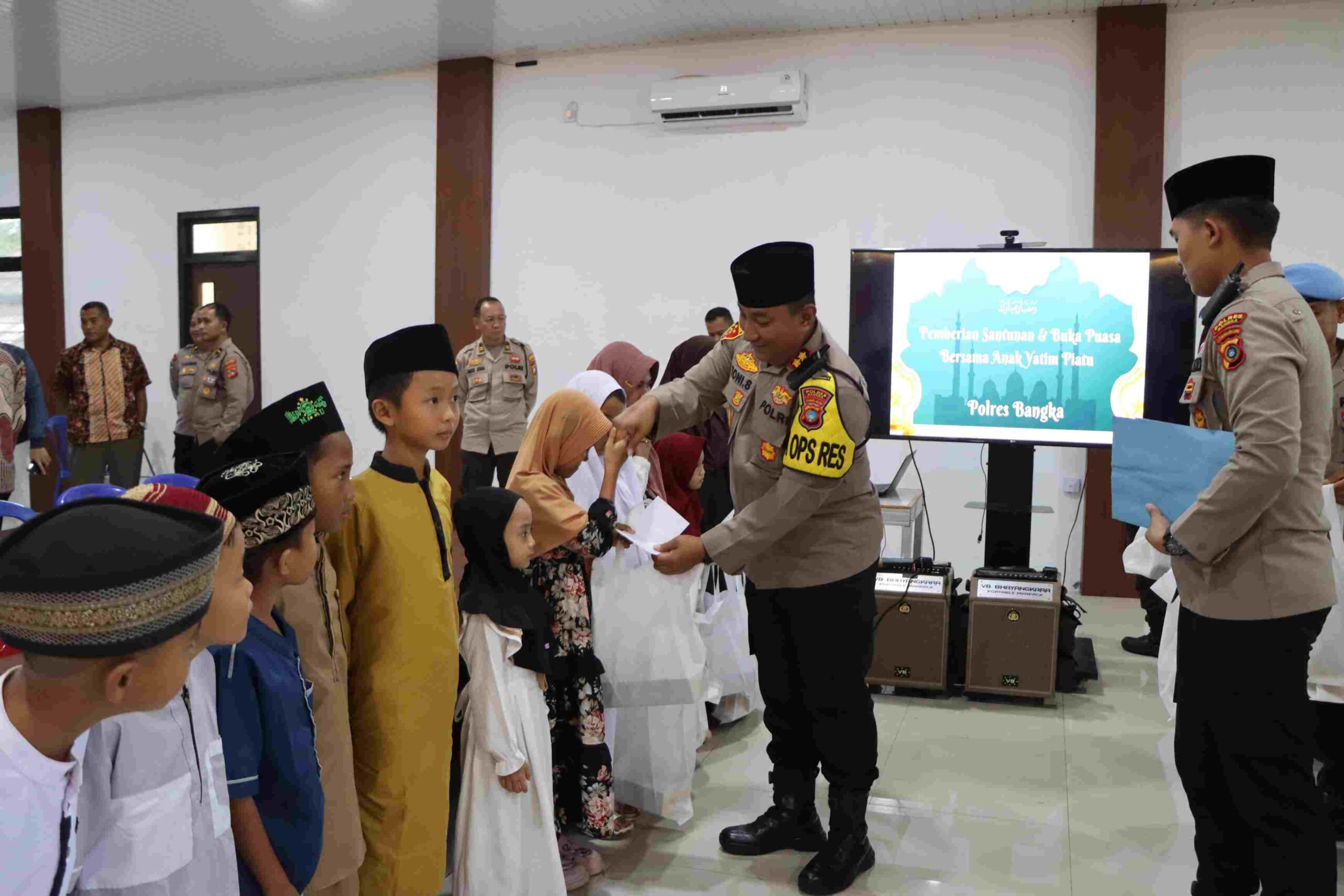 Diakhir acara Kapolres Bangka berserta Waka Polres dan Pju Polres Bangka memberikan santunan kepada anak anak yatim piatu serta melakukan buka puasa bersama.