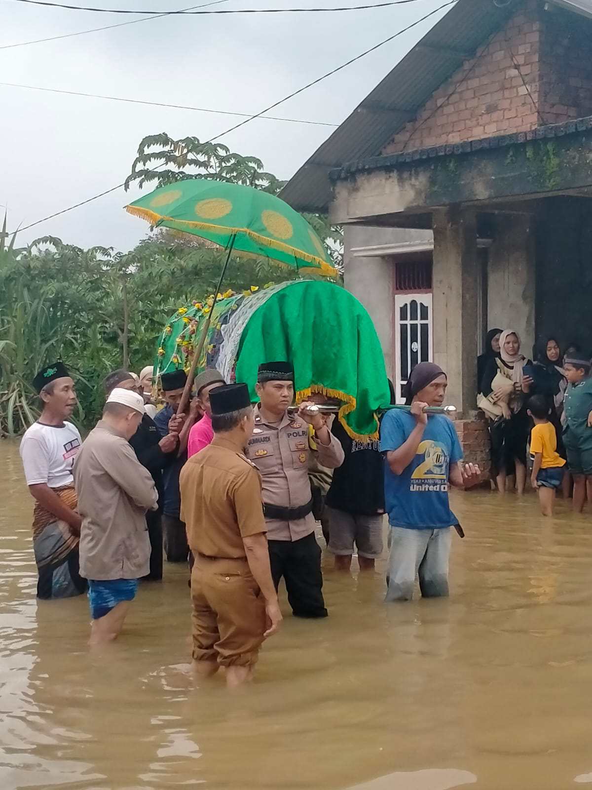 BKTM Sijenjang Aipda Gunnardi turut usung keranda walau situasi banjir , wujud Polri Untuk Masyarakat , kepedulian tersebut semoga menciptakan kepercayaan masyarakat terhadap Polri yang melindungi dan mengayomi masyarakat, Dan kegiatan dilakukan atas dasar kepedulian dan Polri Peduli” IPDA Deddy.