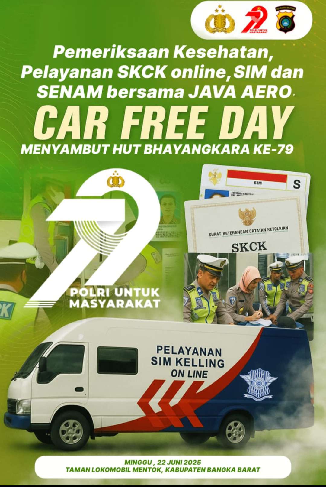 BANGKA BARAT, MB1 II Besok pagi, Polres Bangka Barat akan menggelar acara Car Free Day yang spesial dan penuh manfaat dalam rangka menyambut Hari Ulang Tahun Bhayangkara ke-79. Bertempat di Taman Lokomobil Mentok, kegiatan ini dimulai pukul 06.00 WIB dan terbuka untuk seluruh masyarakat Kabupaten Bangka Barat.