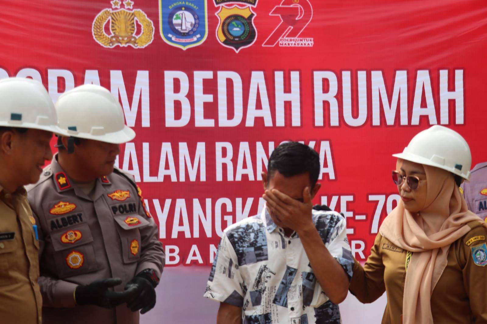 BANGKA BARAT, MB1 II Kebahagiaan dan rasa haru menyelimuti wajah dua warga Kecamatan Mentok, Kabupaten Bangka Barat, saat menerima bantuan program bedah rumah dari Polres Bangka Barat dalam rangka memperingati Hari Bhayangkara ke-79.Selasa, 24 Juni 2025