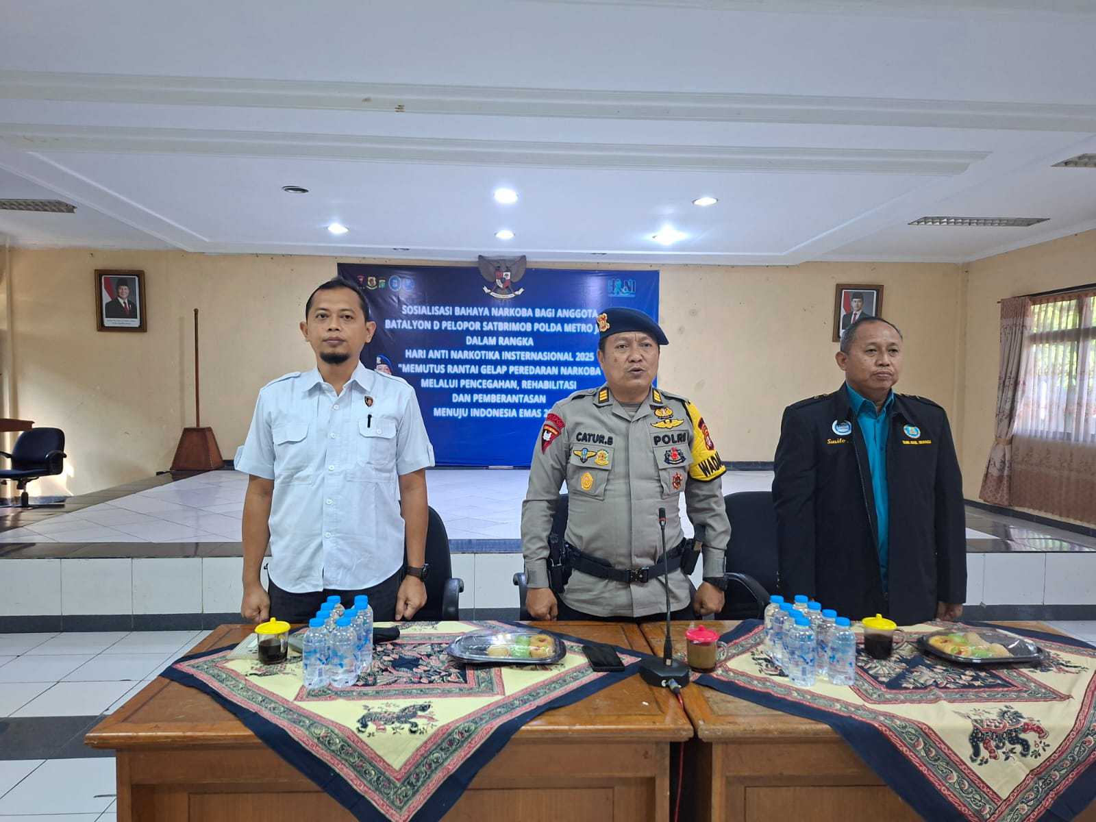 KABUPATEN BEKASI MB1 II Dalam rangka menyambut Hari Anti Narkotika Internasional (HANI) 2025, Badan Narkotika Kabupaten (BNK) Bekasi bersama Batalyon D Pelopor Brimob Polda Metro Jaya melakukan Sosialisasi Bahaya Narkoba dan Tes Urine terhadap anggota Brimob Yang bertempat di Aula Batalyon D Pelopor BRIMOB Polda Metro Jaya, jl.Jagasatru ,Tegal Mukti Kecamatan Cikarang Pusat Kabupaten Bekasi, pada 2025.