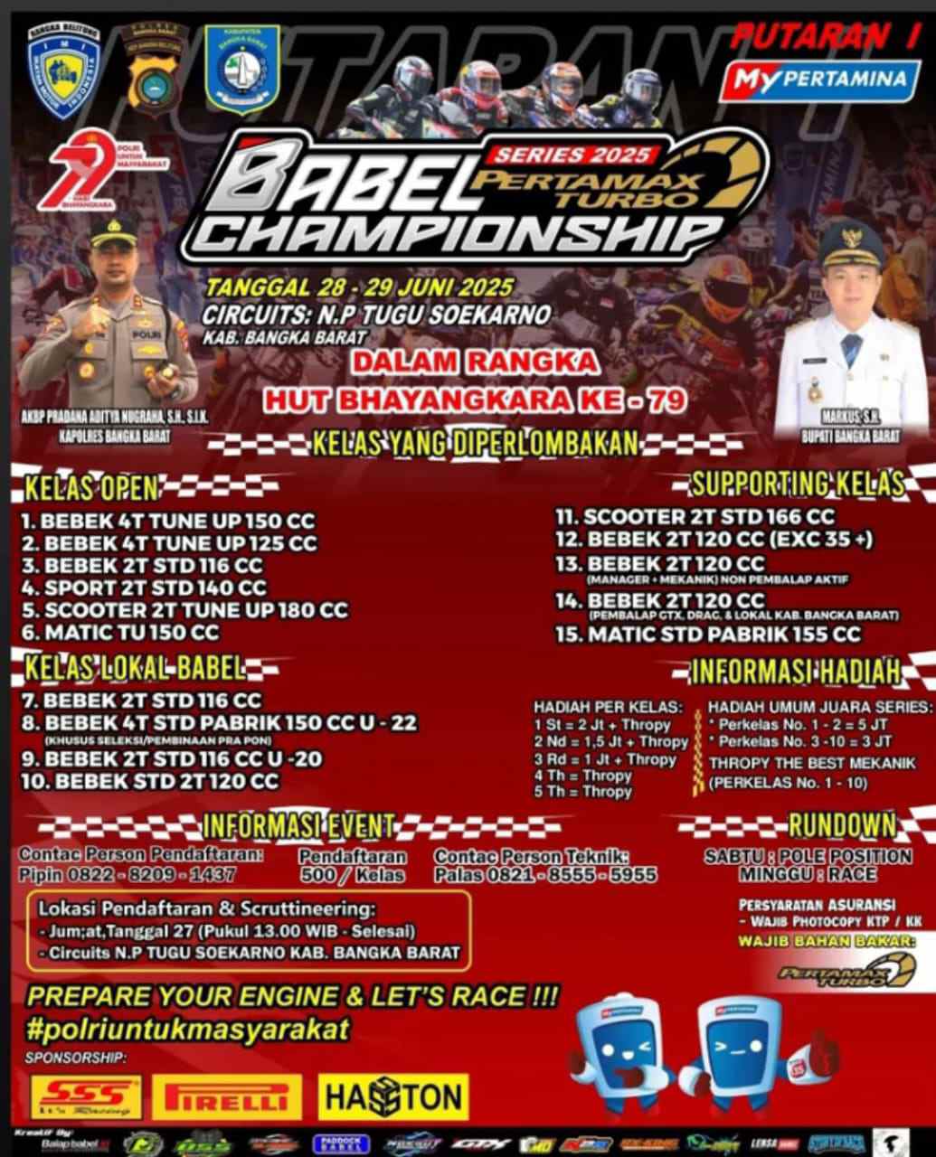 BANGKA BARAT, MB1 II Dalam rangka memperingati Hari Bhayangkara ke-79 Tahun 2025, Polres Bangka Barat bersama Pemerintah Daerah dan para komunitas otomotif menggelar ajang bergengsi Road Race Babel Pertamax Turbo Championship Series I, yang akan diselenggarakan selama dua hari, pada Sabtu dan Minggu, 28–29 Juni 2025, bertempat di Sirkuit Non Permanen (N.P) Tugu Soekarno, Kecamatan Mentok, Kabupaten Bangka Barat.