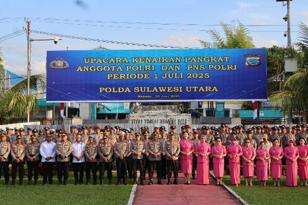 MANAD0 – SULUT, MB1 II Sebanyak 257 personel Polri di lingkungan Satuan Kerja Polda Sulut mendapatkan kenaikan pangkat setingkat lebih tinggi periode 1 Juli 2025. Upacara Laporan Kenaikan Pangkat digelar di Lapangan Presisi Polda Sulut, Senin (30/6/2025) sore, dipimpin Kapolda Sulut Irjen Pol Roycke Harry Langie, dihadiri oleh Wakapolda Brigjen Pol Awi Setiyono, para PJU Polda dan Bhayangkari.