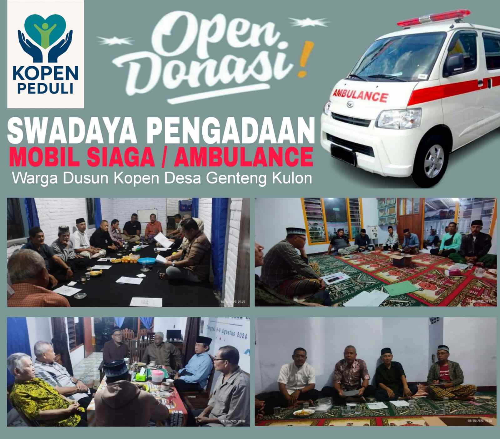 Masih kata Kepala Desa Genteng Kulon, “ide tersebut dari warga Kopen, untuk pengadaan mobil Ambulance, tujuannya untuk mengantar orang sakit, dan untuk mengatar jenazah, gratis untuk warga kopen, dan sebetulnya bersamaan dengan ide tersebut Kopen sudah mempunyai 1 (satu) mobil Ambulance di RW. 001 Dusun Kopen,” pungkasnya.