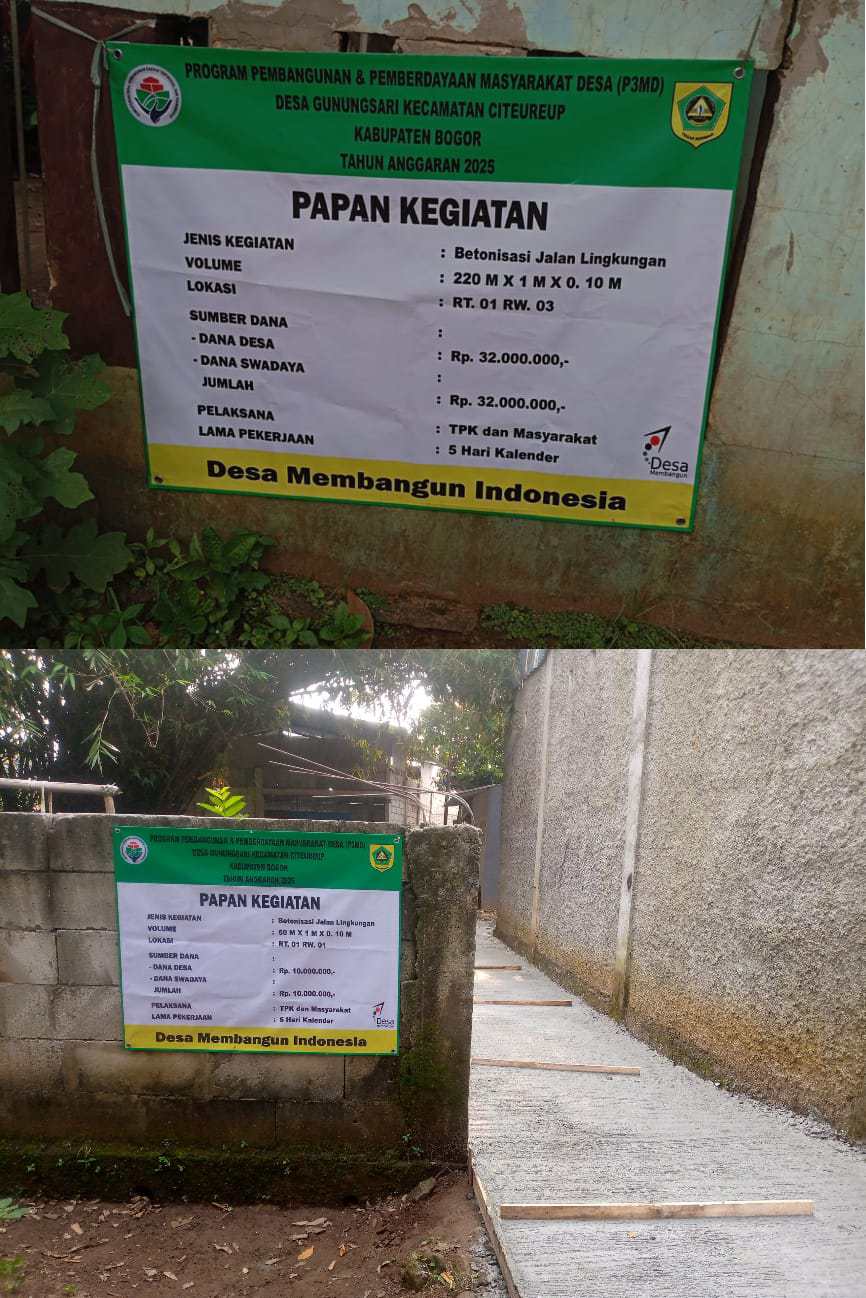 CITEREUP – BOGOR, MB1 II Dalam rangka meningkatkan infrastruktur dasar dan menunjang aksesibilitas warga, Pemerintah Desa Gunung Sari, Kecamatan Citeureup, Kabupaten Bogor, melaksanakan kegiatan betonisasi jalan lingkungan di dua titik berbeda pada Tahun Anggaran 2025.