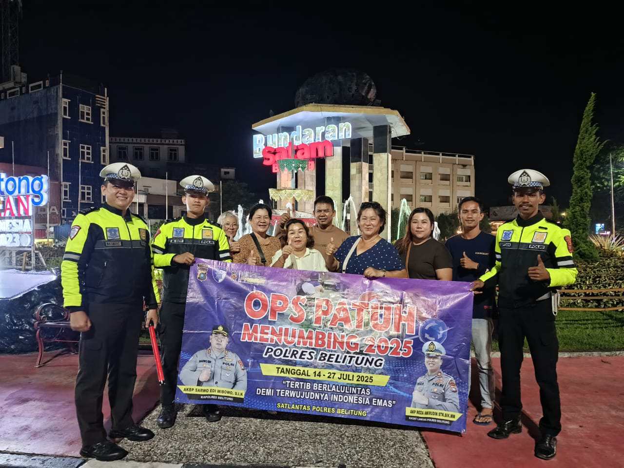 BELITUNG, MB1 II Dalam rangka mendukung pelaksanaan Operasi Patuh Menumbing 2025, Sat Lantas Polres Belitung melaksanakan kegiatan Patroli Kegiatan Rutin Yang Ditingkatkan (KRYD) Cooling System, pembagian brosur, dan penyampaian himbauan keselamatan berlalu lintas dari Direktorat Lalu Lintas, Sabtu (19/07/2025) malam.