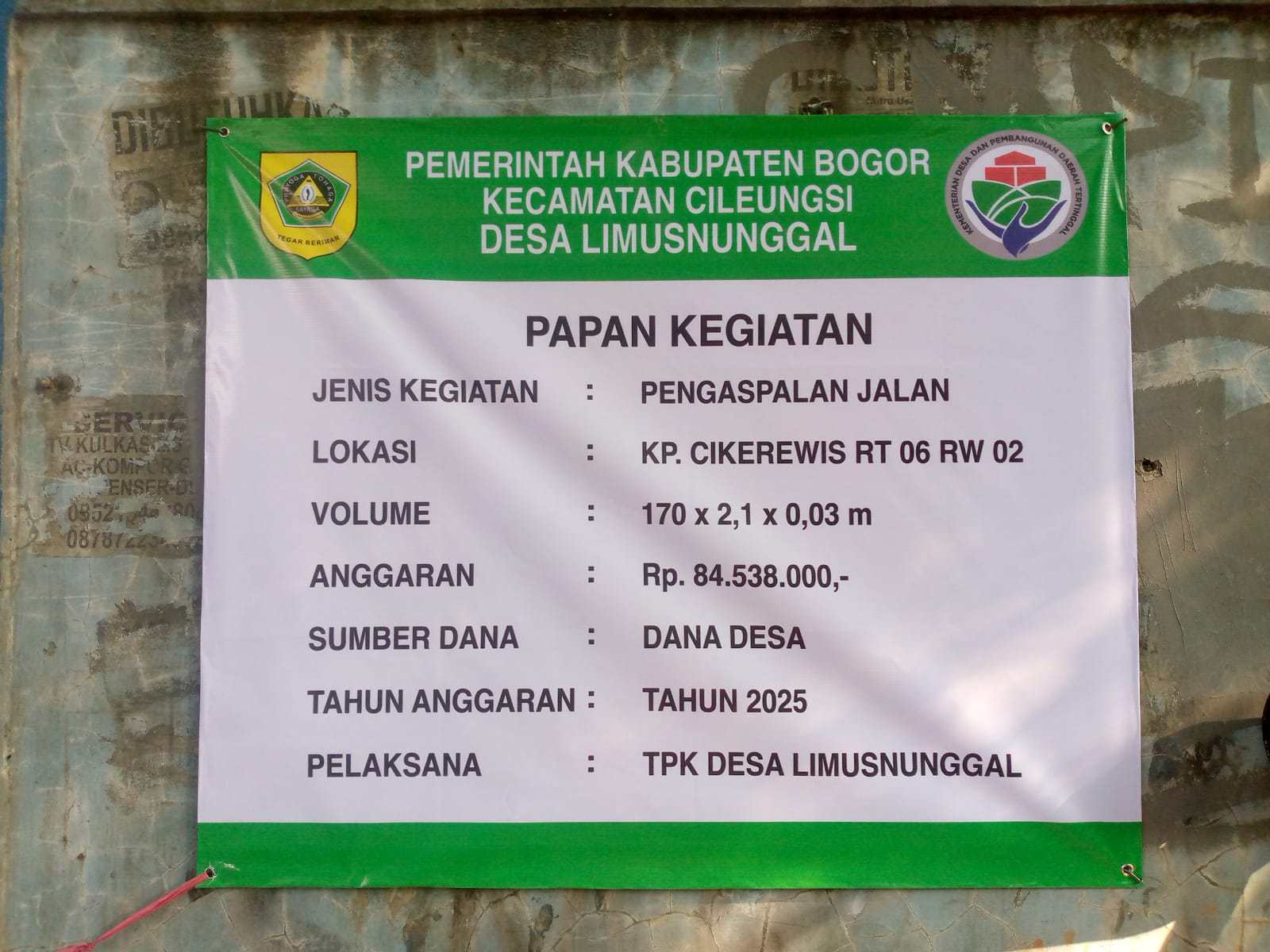 CILEUNGSI – BOGOR, MB1 II Pemerintah Desa Limusnunggal, Kecamatan Cileungsi, Kabupaten Bogor, di bawah kepemimpinan Kepala Desa H. Galih Rakasiwi, S.Ip., terus mendorong percepatan pembangunan infrastruktur demi kenyamanan dan kemajuan desa. Salah satu upaya nyata dilakukan melalui program pengaspalan jalan di Kampung Cikerewis RT 06 RW 02.