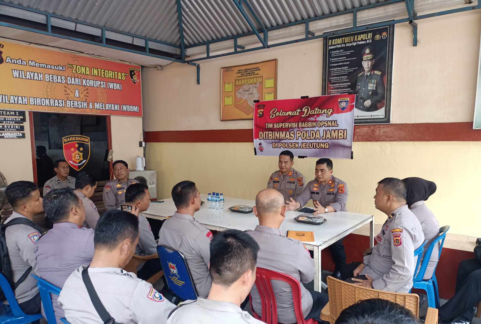 KOTA JAMBI, MB1 II Polsek Jelutung menerima kunjungan Tim Supervisi Bagbin Opsnal Ditbinmas Polda Jambi di Mapolsek Jelutung (29/07). Kapolsek Jelutung Iptu Choiril Umam Fauzi menyambut langsung tim yang dipimpin AKBP Mulyadi , Kompol M.Gea dan tim.